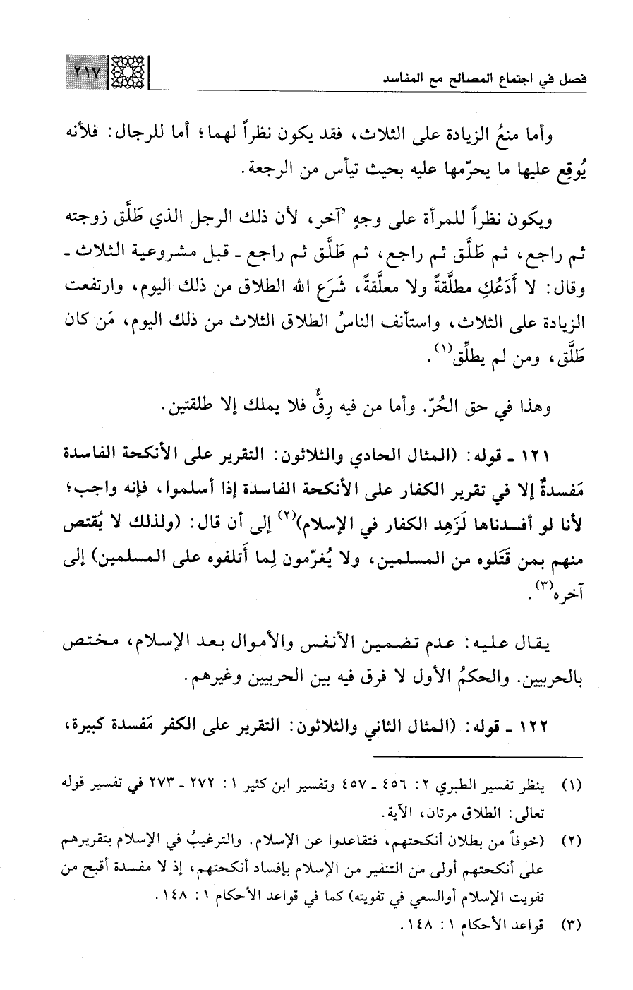 121 - قوله: (المثال الحادي والثلاثون: التقرير على الأنكحة الفاسدة مَفسدةٌ إلا في تقرير الكفار على الأنكحة الفاسدة إذا أسلموا، فإنه واجب؛ لأنا لو أفسدناها لَزَهِد الكفار في الإسلام) (¬2) إلى أن قال: (ولذلك لا يُقتص منهم بمن قَتَلوه من المسلمين، ولا يُغرّمون لِما أَتلفوه على المسلمين) إلى آخره (¬3).