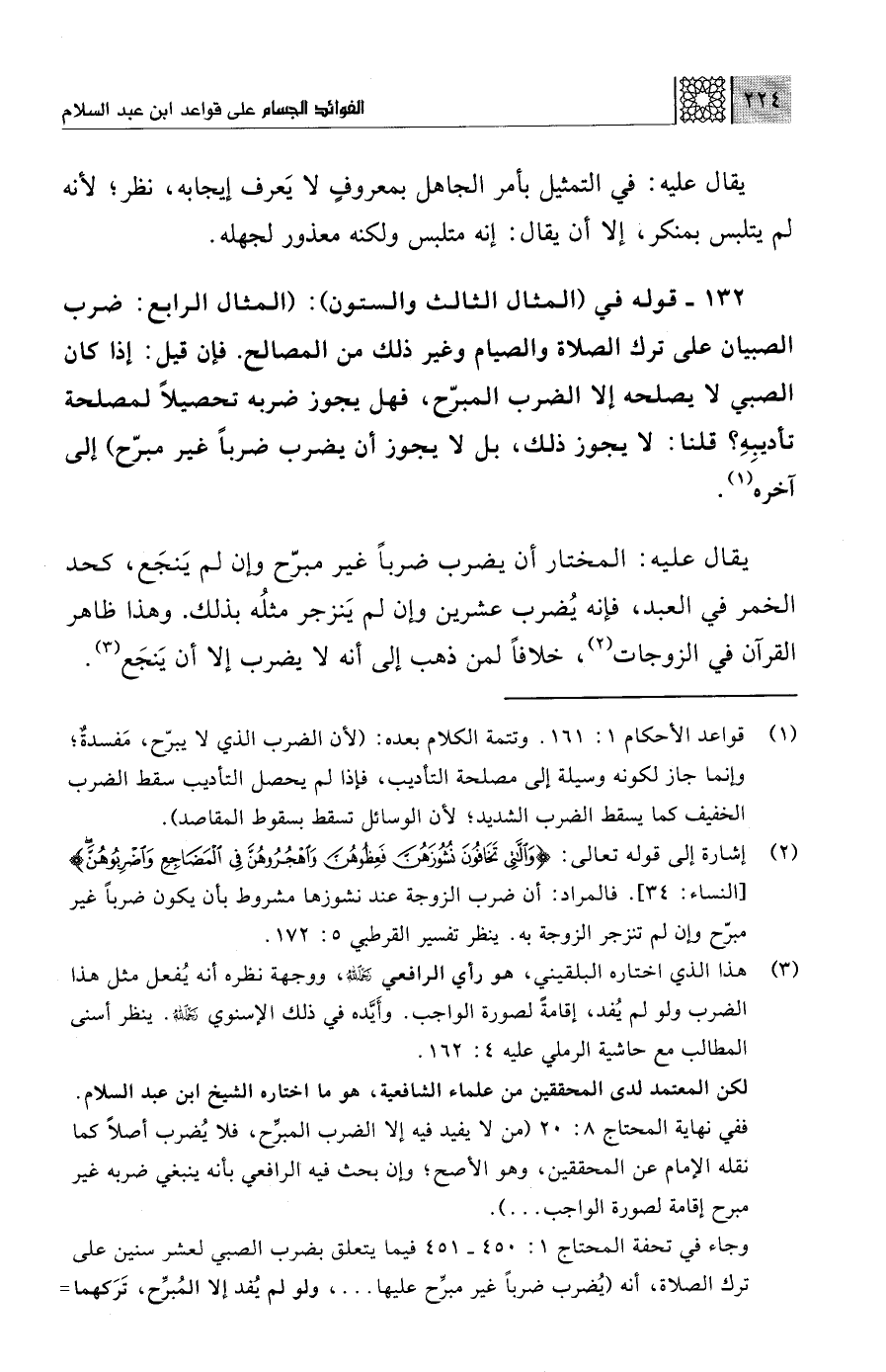 (¬2) إشارة إلى قوله تعالى: {وَاللَّاتِي تَخَافُونَ نُشُوزَهُنَّ فَعِظُوهُنَّ وَاهْجُرُوهُنَّ فِي الْمَضَاجِعِ وَاضْرِبُوهُنَّ} [النساء: 34]. فالمراد: أن ضرب الزوجة عند نشوزها مشروط بأن يكون ضربًا غير مبرّح وإن لم تنزجر الزوجة به. ينظر تفسير القرطبي 5: 172.