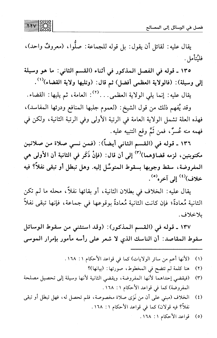 135 - قوله في الفصل المذكور في أثناء (القسم الثاني: ما هو وسيلة إلى وسيلة): (فالولاية العظمى أفضل) ثم قال: (وتليها ولاية القضاء) (¬1).
