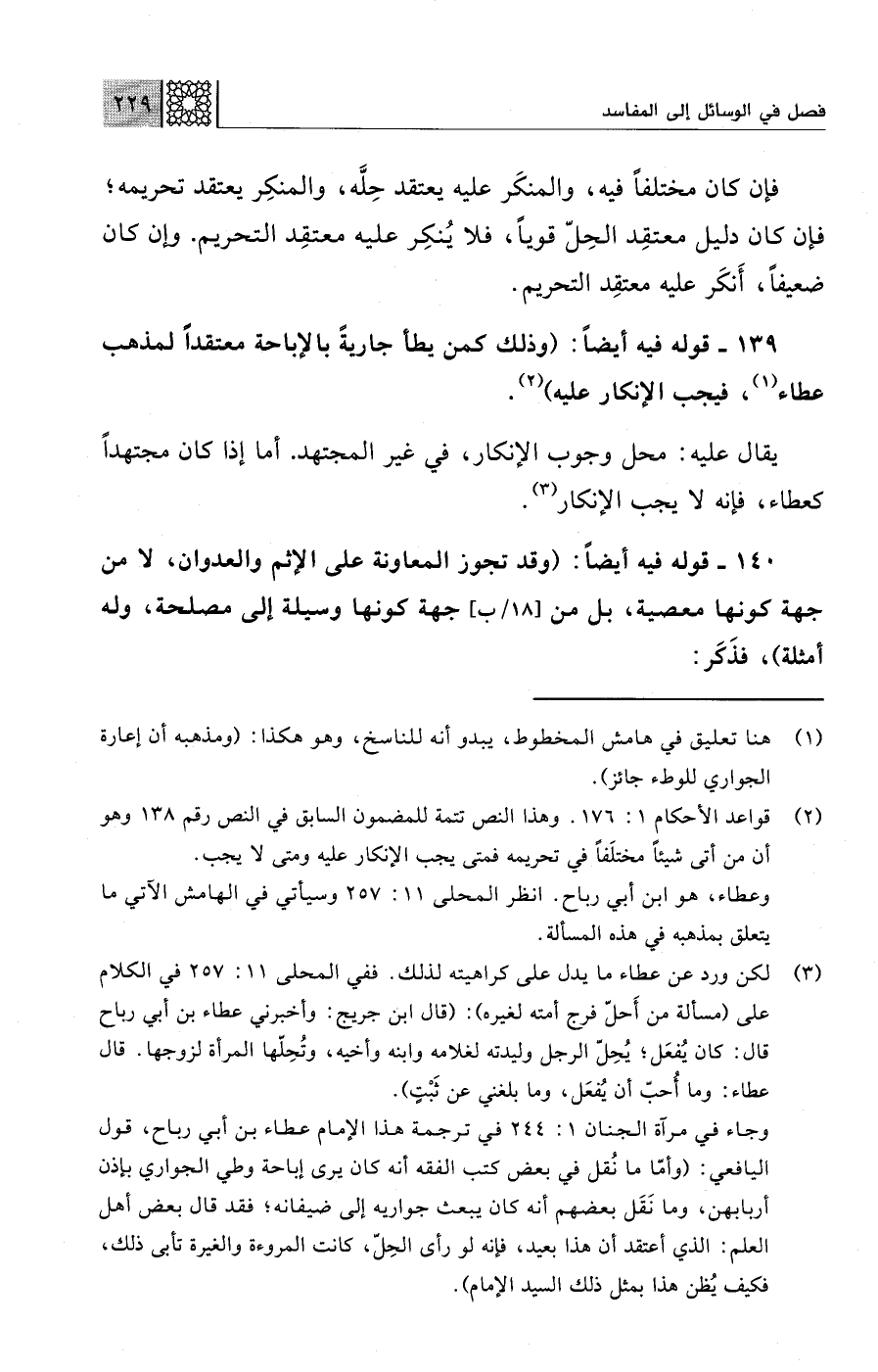 (¬2) قواعد الأحكام 1: 176. وهذا النص تتمة للمضمون السابق في النص رقم 138 وهو أن من أتى شيئًا مختلَفًا في تحريمه فمتى يجب الإنكار عليه ومتى لا يجب.