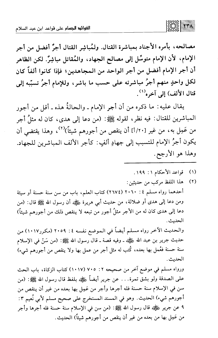 مصالحه، بأمره الأجناد بمباشرة القتال. ولمُباشِر القتال أجرٌ أفضل من أجر الإمام، لأن الإمام متوسِّل إلى مصالح الجهاد، والمُقاتل مباشِرٌ. لكن الظاهر أن أجر الإمام أفضل من أجر الواحد من المجاهدين؛ فإذا كانوا ألفًا كان لكل واحدٍ منهم أجرُ مباشرته على حسب ما باشر، وللإمام أجرُ تسبّبه إلى قتال الألف) إلى آخره (¬1).