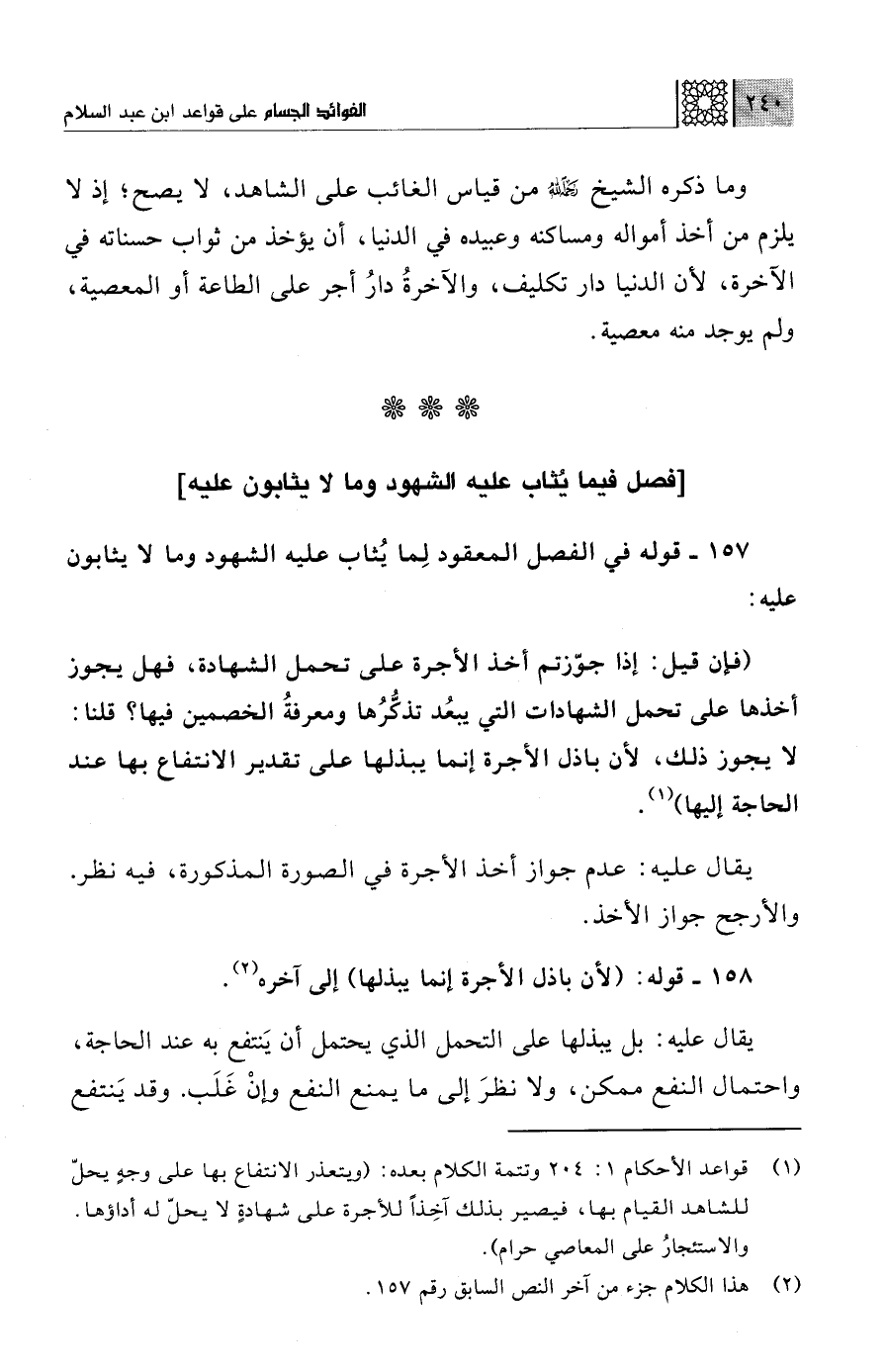 (¬1) قواعد الأحكام 1: 204 وتتمة الكلام بعده: (ويتعذر الانتفاع بها على وجهٍ يحلّ للشاهد القيام بها، فيصير بذلك آخِذًا للأجرة على شهادةٍ لا يحلّ له أداؤها. والاستئجارُ على المعاصي حرام).