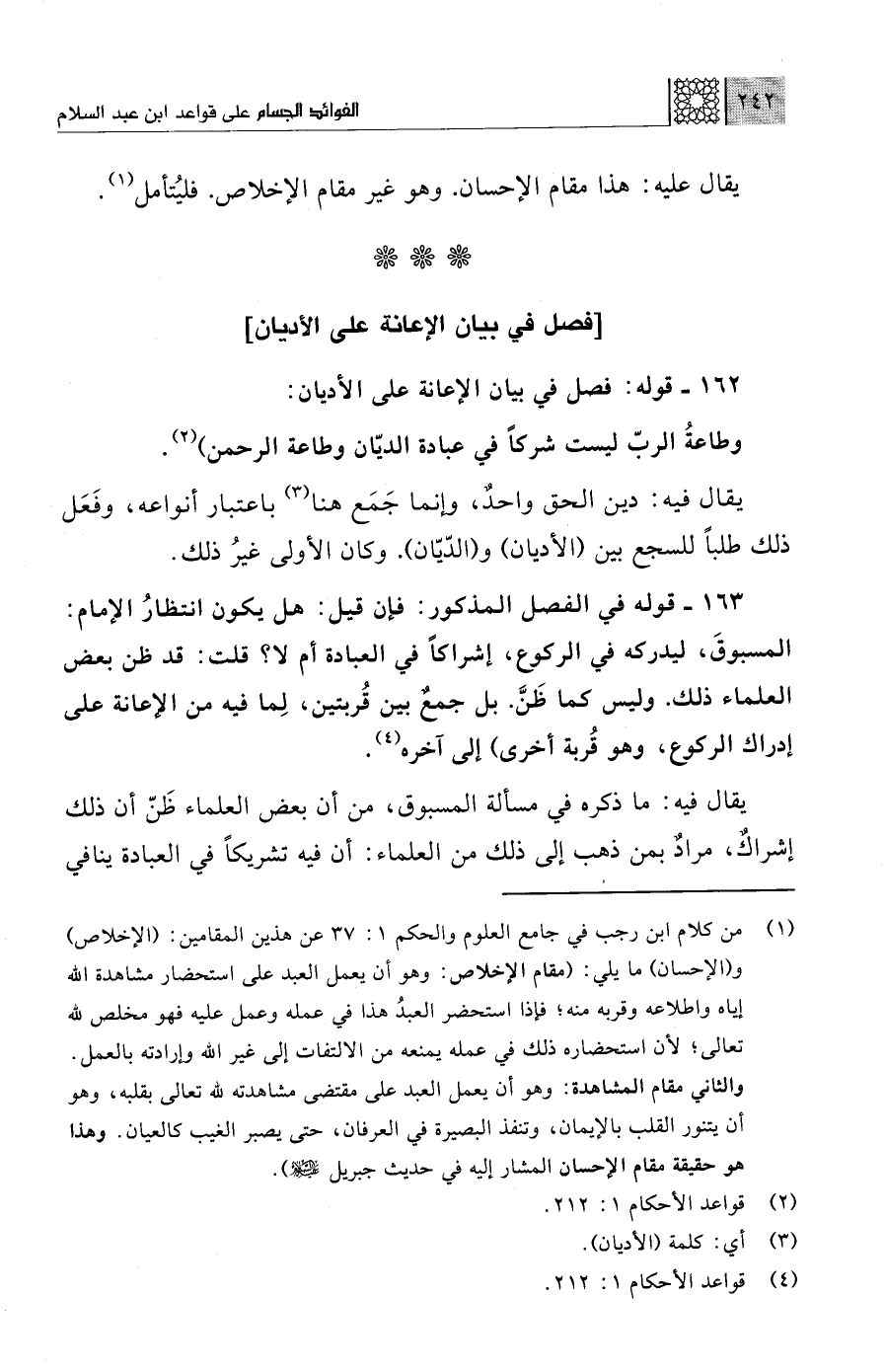 (¬1) من كلام ابن رجب في جامع العلوم والحكم 1: 37 عن هذين المقامين: (الإخلاص) و (الإحسان) ما يلي: (مقام الإخلاص: وهو أن يعمل العبد على استحضار مشاهدة الله إياه واطلاعه وقربه منه؛ فماذا استحضر العبدُ هذا في عمله وعمل عليه فهو مخلص لله تعالى؛ لأن استحضاره ذلك في عمله يمنعه من الالتفات إلى غير الله وإرادته بالعمل. والثاني مقام المشاهدة: وهو أن يعمل العبد على مقتضى مشاهدته لله تعالى بقلبه، وهو أن يتنور القلب بالإيمان، وتنفذ البصيرة في العرفان، حتى يصبر الغيب كالعيان. وهذا هو حقيقة مقام الإحسان المشار إليه في حديث جبريل - عليه السلام -).