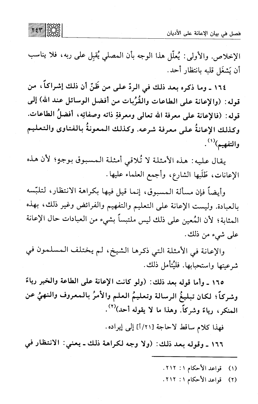 164 - وما ذكره بعد ذلك في الردّ على من ظَنّ أن ذلك إشراكًا، من قوله: (والإعانة على الطاعات والقُرُبات من أفضل الوسائل عند الله) إلى قوله: (فالإعانة على معرفة الله تعالى ومعرفةِ ذاته وصفاتِه، أفضلُ الطاعات. وكذلك الإعانةُ على معرفة شرعه. وكذلك المعونةُ بالفتاوى والتعليم والتفهيم) (¬1).