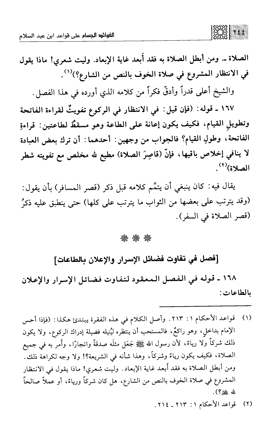 (¬1) قواعد الأحكام 1: 213. وأصل الكلام في هذه الفقرة يبتدئ هكذا: (فإذا أحس الإمام بداخلٍ، وهو راكعٌ، فالمستحب أن ينتظره ليُنيله فضيلة إدراك الركوع، ولا يكون ذلك شركًا ولا رياءً، لأن رسول الله - صلى الله عليه وسلم - جَعَل مثلَه صدقةً واتجارًا، وأَمر به في جميع الصلاة، فكيف يكون رياءً وشركًا، وهذا شأنه في الشريعة؟! ولا وجه لكراهة ذلك. ومن أبطل الصلاة به فقد أَبعد غاية الإبعاد. وليت شعري! ماذا يقول في الانتظار المشروع في صلاة الخوف بالمص من الشارع، هل كان شركًا ورياءً، أو عملًا صالحًا لله - عزَّ وجلَّ -؟).