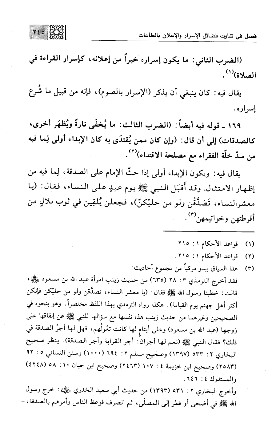 169 - قوله فيه أيضًا: (الضرب الثالث: ما يُخفَى تارةً ويُظهَر أخرى، كالصدقات) إلى أن قال: (وإن كان ممن يُقتدَى به كان الإبداء أولى لِما فيه من سدّ خلّة الفقراء مع مصلحة الاقتداء) (¬2).