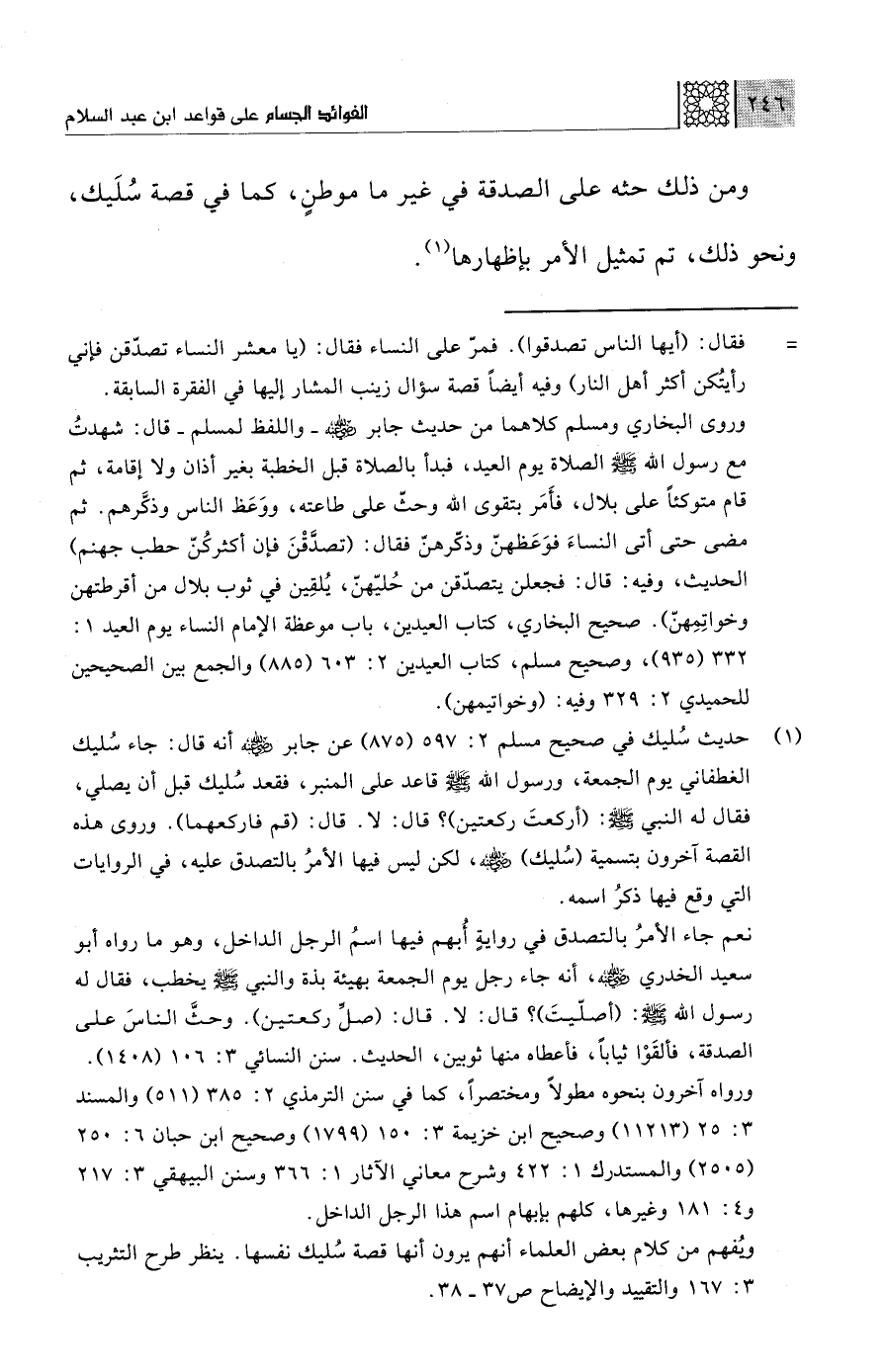 (¬1) حديث سُليك في صحيح مسلم 2: 597 (875) عن جابر - رضي الله عنه - أنه قال: جاء سُليك الغطفاني يوم الجمعة، ورسول الله - صلى الله عليه وسلم - قاعد على المنبر، ففعد سُليك قبل أن يصلي، فقال له النبي - صلى الله عليه وسلم -: (أركعتَ ركعتين)؛ قال: لا. قال: (قم فاركعهما). وروى هذه القصة آخرون بتسمية (سُليك) - رضي الله عنه -، لكن ليس فيها الأمرُ بالتصدق عليه، في الروايات التي وقع فيها ذكرُ اسمه.