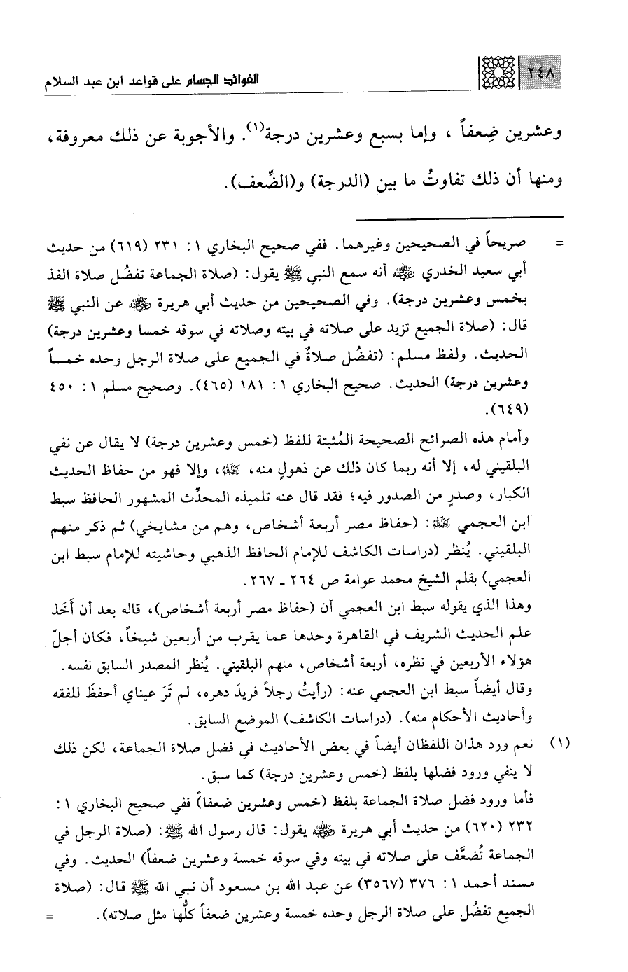 (¬1) نعم ورد هذان اللفظان أيضًا في بعض الأحاديث في فضل صلاة الجماعة، لكن ذلك لا ينفي ورود فضلها بلفظ (خمس وعشرين درجة) كما سبق.