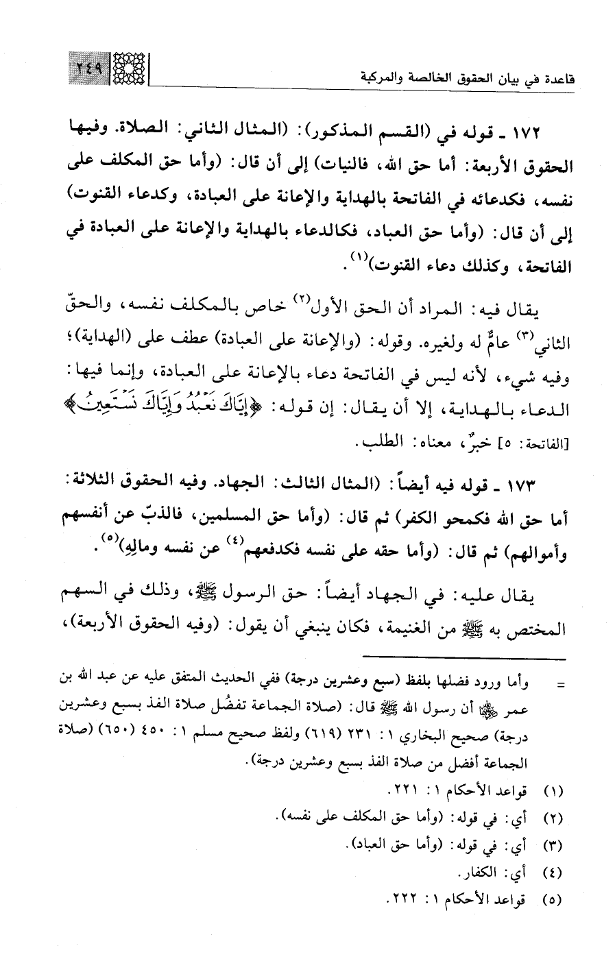 172 - قوله في (القسم المذكور): (المثال الثاني: الصلاة. وفيها الحقوق الأربعة: أما حق الله، فالنيات) إلى أن قال: (وأما حق المكلف على نفسه، فكدعائه في الفاتحة بالهداية والإعانة على العبادة، وكدعاء القنوت) إلى أن قال: (وأما حق العباد، فكالدعاء بالهداية والإعانة على العبادة في الفاتحة، وكذلك دعاء القنوت) (¬1).