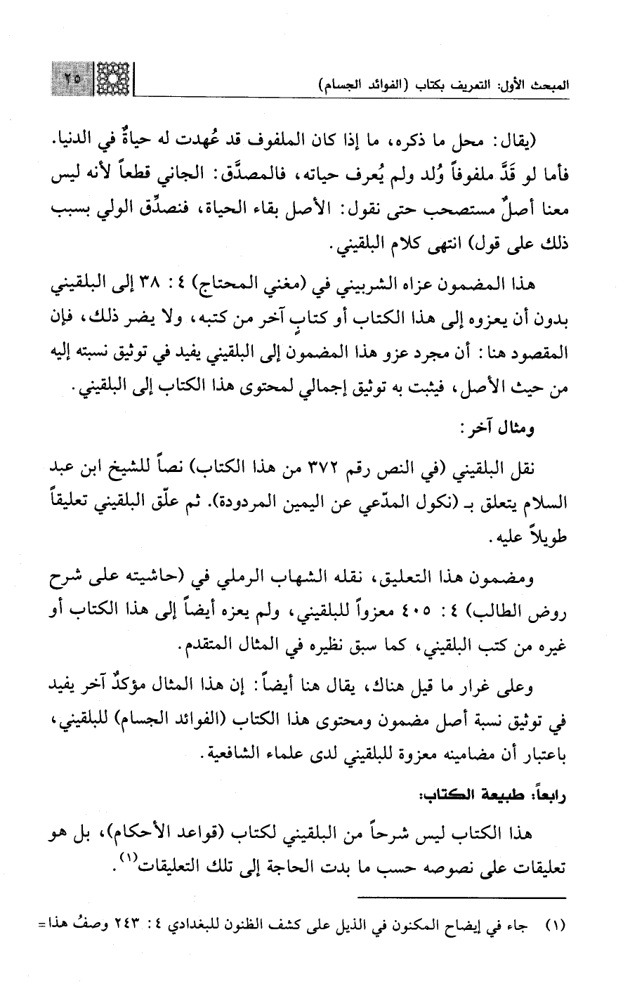 هذا المضمون عزاه الشربيني في (مغني المحتاج) 4: 38 إلى البلقيني بدون أن يعزوه إلى هذا الكتاب أو كتابٍ آخر من كتبه، ولا يضر ذلك، فإن المقصود هنا: أن مجرد عزو هذا المضمون إلى البلقيني يفيد في توثيق نسبته إليه من حيث الأصل، فيثبت به توثيق إجمالي لمحتوى هذا الكتاب إلى البلقيني.