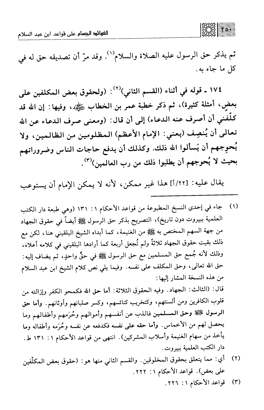 (¬1) جاء في إحدى النسخ المطبوعة من قواعد الأحكام 1: 131 (وهي طبعة دار الكتب العلمية ببيروت دون تاريخ)، التصريح بذكر حق الرسول - صلى الله عليه وسلم - أيضًا في حقوق الجهاد من جهة السهم المختص به - صلى الله عليه وسلم - من الغنيمة، كما أبداه الشيخ البلقيني هنا، لكن مع ذلك بقيت حقوق الجهاد ثلاثة ولم تُجعل أربعة كما أرادها البلقيني في كلامه أعلاه، وذلك لأنه جُمع حق المسلمين مع حق الرسول - صلى الله عليه وسلم - في حقٍّ واحدٍ، ثم يضاف إليه: حق الله تعالى، وحق المكلف على نفسه. وفيما يلي نص كلام الشيخ ابن عبد السلام من هذه النسخة المشار إليها: