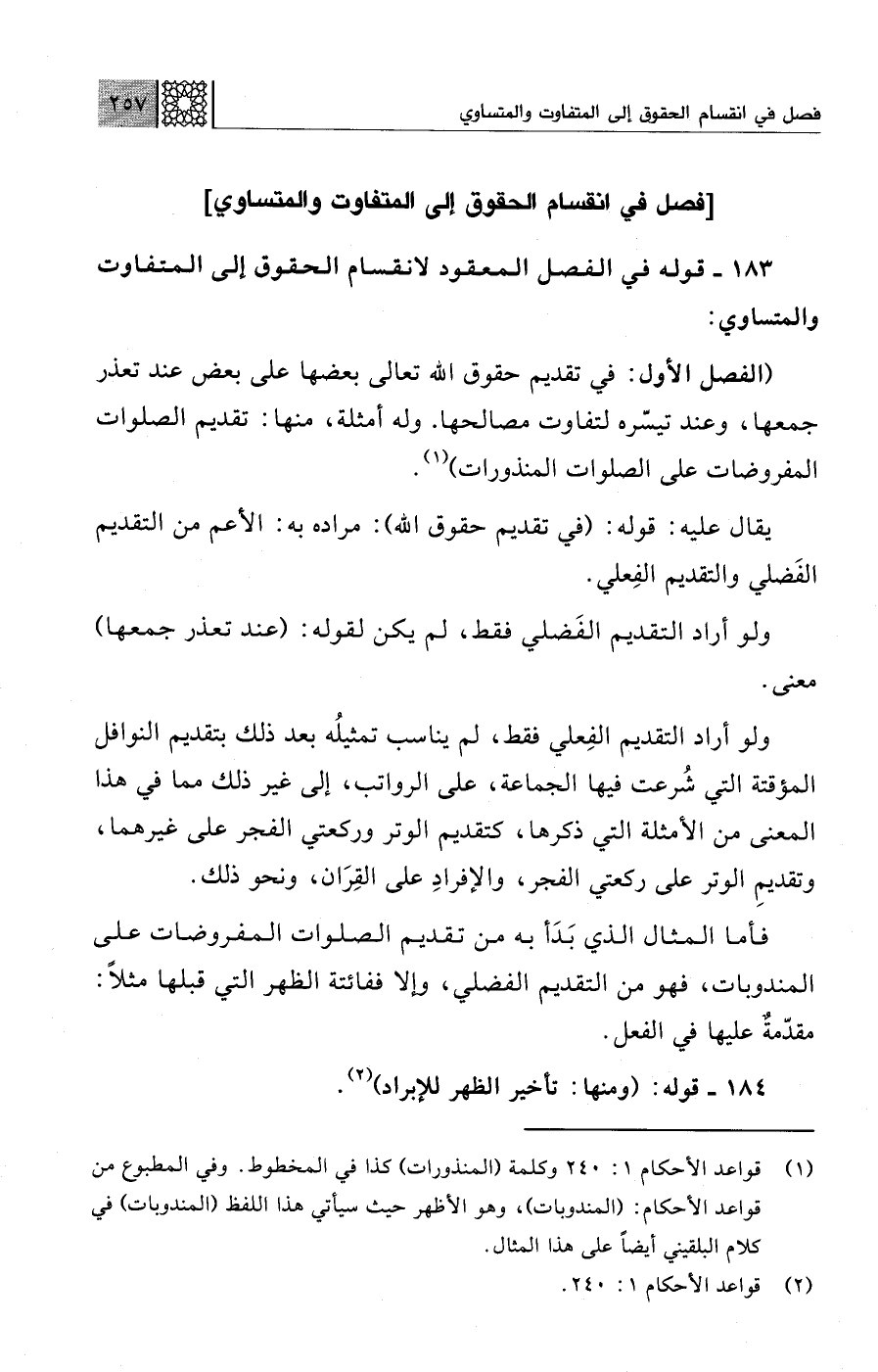 183 - قوله في الفصل المعقود لانقسام الحقوق إلى المتفاوت والمتساوي: