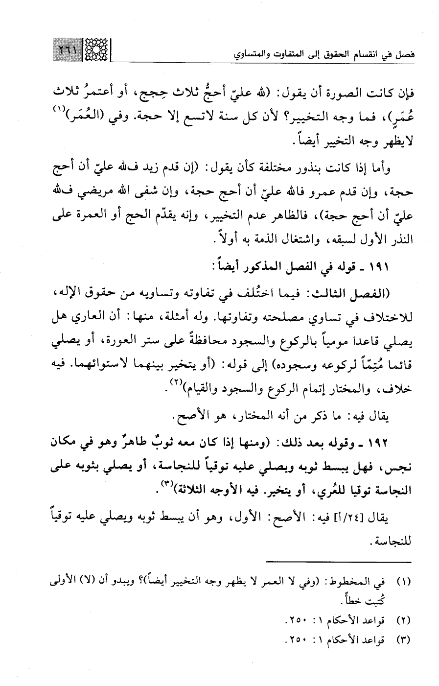 (الفصل الثالث: فيما اختُلف في تفاوته وتساويه من حقوق الإله، للاختلاف في تساوي مصلحته وتفاوتها. وله أمثلة، منها: أن العاري هل يصلي قاعدا موميًا بالركوع والسجود محافظةً على ستر العورة، أو يصلي قائما مُتِمًّا لركوعه وسجوده) إلى قوله: (أو يتخير بينهما لاستوائهما. فيه خلاف، والمختار إتمام الركوع والسجود والقيام) (¬2).