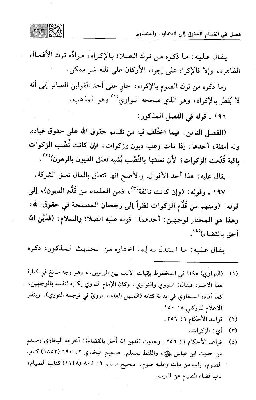 (¬4) قواعد الأحكام 1: 256. وحديث (فدين الله أحق بالقضاء): أخرجه البخاري ومسلم من حديث ابن عباس - رضي الله عنهما -، واللفظ لمسلم. صحيح البخاري 2: 690 (1852) كتاب الصوم، باب من مات وعليه صوم. صحيح مسلم 2: 804 (1148) كتاب الصيام، باب قضاء الصيام عن الميت.