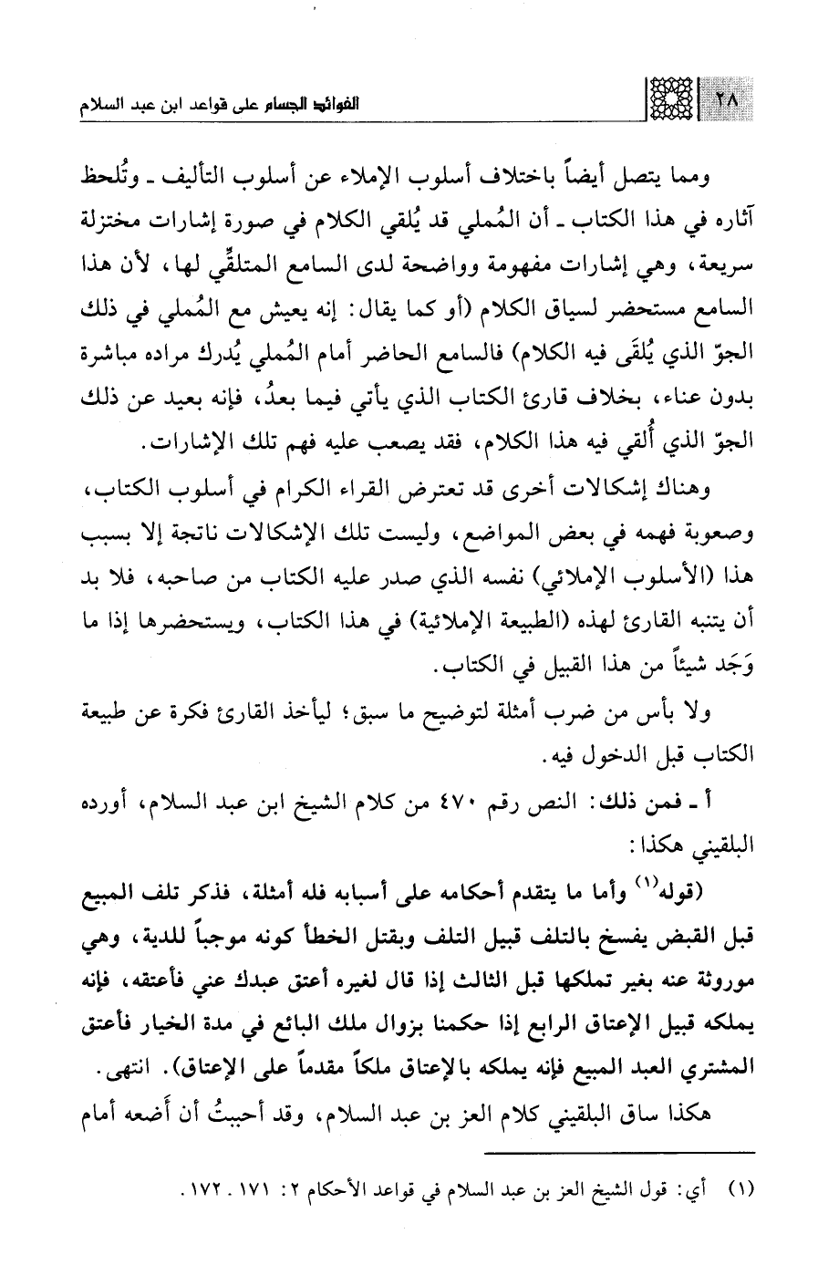 هكذا ساق البلقيني كلام العز بن عبد السلام، وقد أحببتُ أن أَضعه أمام