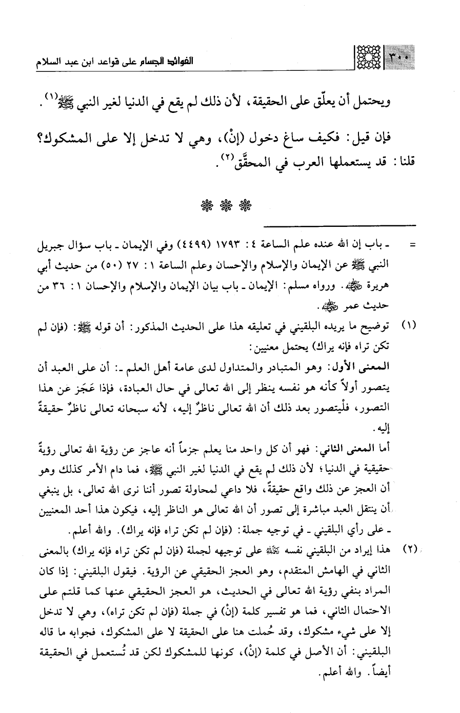 (¬2) هذا إيراد من البلقيني نفسه رحمه الله على توجيهه لجملة (فإن لم تكن تراه فإنه يراك) بالمعنى الثاني في الهامش المتقدم، وهو العجز الحقيقي عن الرؤية. فيقول البلقيني: إذا كان المراد بنفي رؤية الله تعالى في الحديث، هو العجز الحقيقي عنها كما قلتم على الاحتمال الثاني، فما هو تفسير كلمة (إنْ) في جملة (فإن لم تكن تراه)، وهي لا تدخل إلا على شيء مشكوك، وقد حُملت هنا على الحقيقة لا على المشكوك، فجوابه ما قاله البلقيني: أن الأصل في كلمة (إنْ)، كونها للمشكوك لكن قد تُستعمل في الحقيقة أيضًا. والله أعلم.