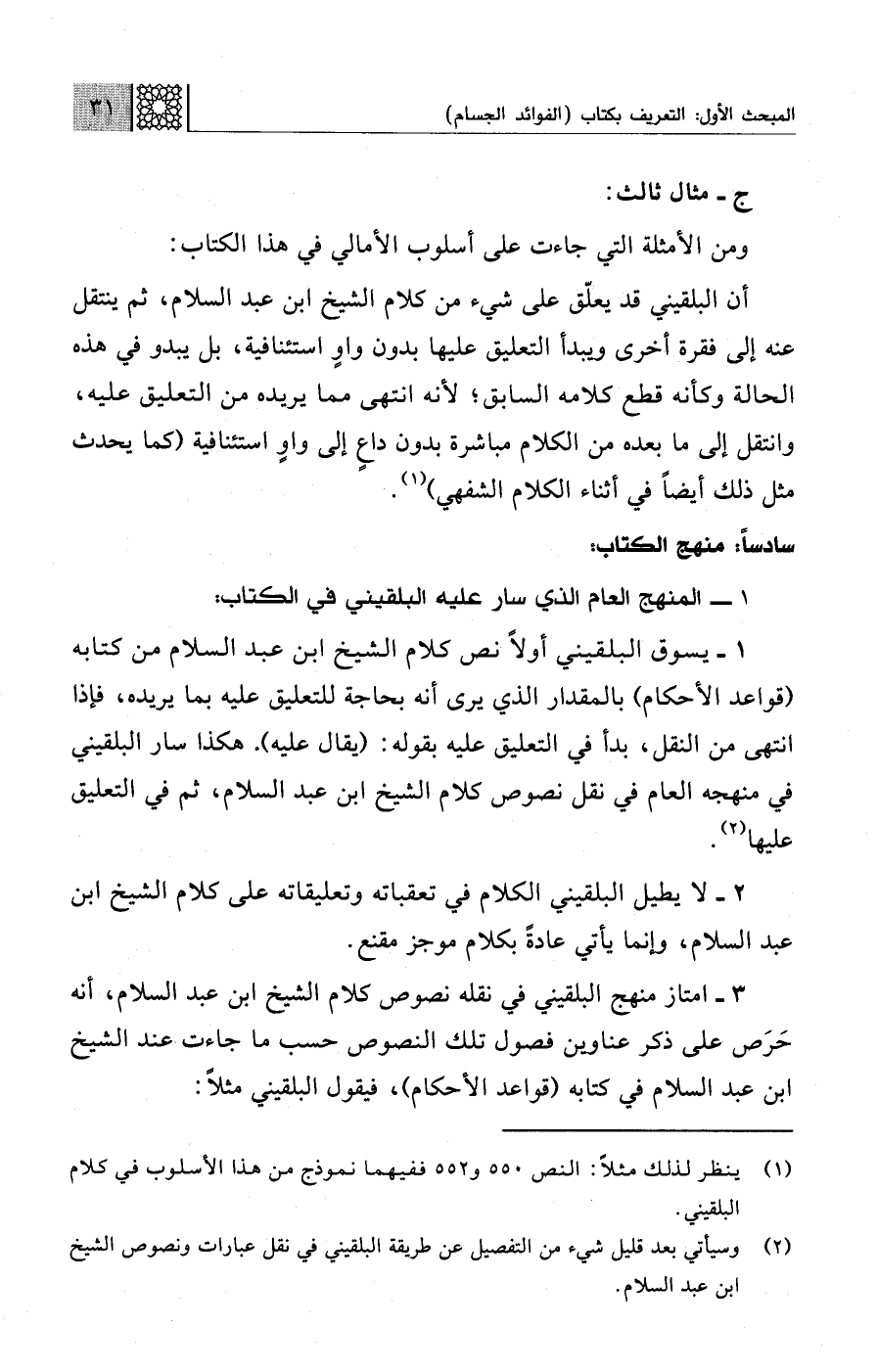 1 - يسوق البلقيني أولًا نص كلام الشيخ ابن عبد السلام من كتابه (قواعد الأحكام) بالمقدار الذي يرى أنه بحاجة للتعليق عليه بما يريده، فإذا انتهى من النقل، بدأ في التعليق عليه بقوله: (يقال عليه). هكذا سار البلقيني في منهجه العام في نقل نصوص كلام الشيخ ابن عبد السلام، ثم في التعليق عليها (¬2).