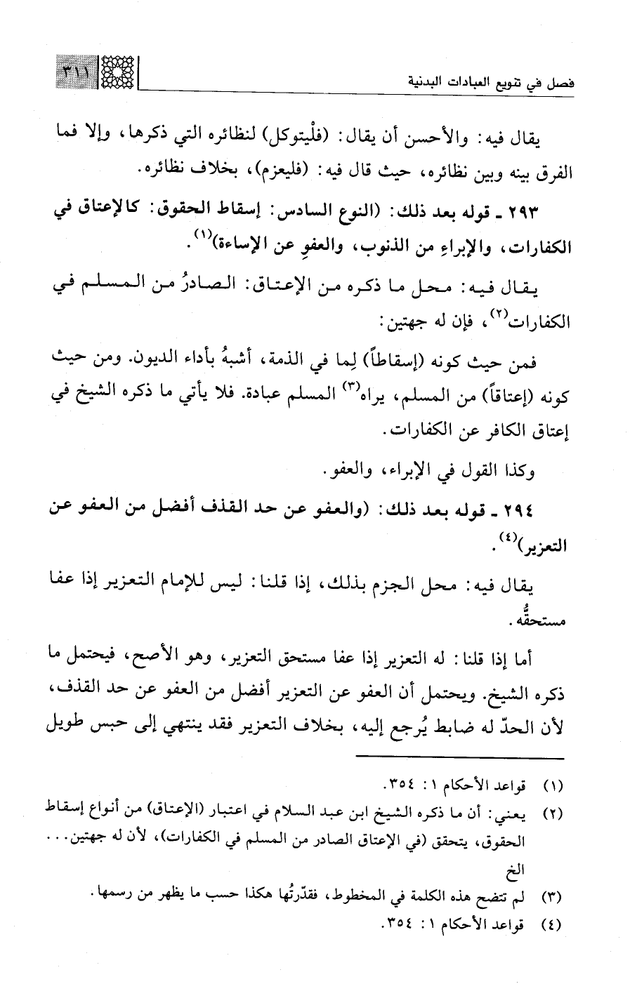 293 - قوله بعد ذلك: (النوع السادس: إسقاط الحقوق: كالإعتاق في الكفارات، والإبراءِ من الذنوب، والعفوِ عن الإساءة) (¬1).