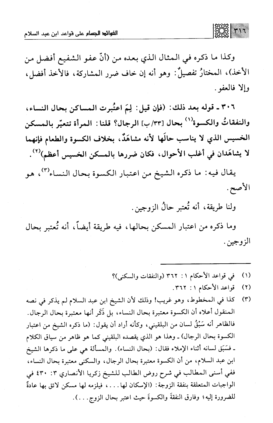 (¬3) كذا في المخطوط، وهو غريب! وذلك لأن الشيخ ابن عبد السلام لم يذكر في نصه المنقول أعلاه أن الكسوة معتبرة بحال النساء، بل ذَكَر أنها معثبرة بحال الرجال. فالظاهر أنه سَبْقُ لسان من البلقيني، وكأنه أراد أن يقول: (ما ذكره الشيخ من اعتبار الكسوة بحال الرجال) -وهذا هو الذي يقصده البلقيني كما هو ظاهر من سياق الكلام- فسَبَق لسانه أثناء الإملاء فقال: (بحال النساء). والمسالة هي على ما ذكرها الشيخ ابن عبد السلام، من أن الكسوة معتبرة بحال الرجال، والسكنى معتبرة بحال النساء، ففي أسنى المطالب في شرح روض الطالب للشيخ زكريا الأنصاري 3: 430 في الواجبات المتعلقة بنفقة الزوجة: (الإسكان لها ... ، فيلزمه لها مسكن لائق بها عادةً للضرورة إليه؛ وفارق النفقةَ والكسوةَ حيث اعتبر بحال الزوج ...).