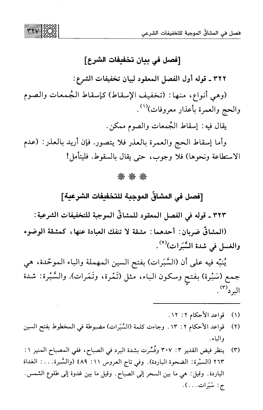 323 - قوله في الفصل المعقود للمشاقّ الموجبة للتخفيفات الشرعية: