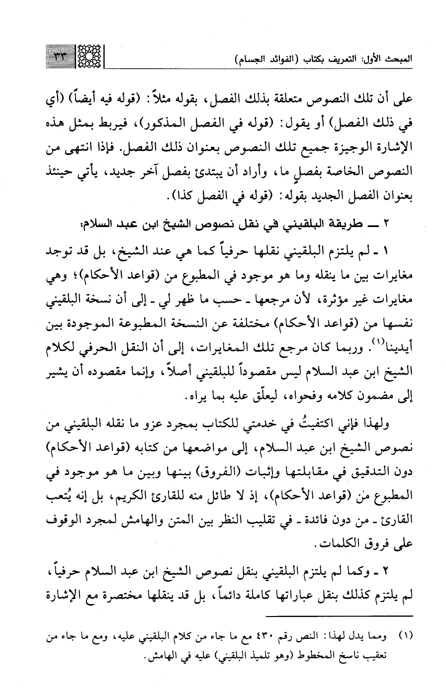 1 - لم يلتزم البلقيني نقلها حرفيًّا كما هي عند الشيخ، بل قد توجد مغايرات بين ما ينقله وما هو موجود في المطبوع من (قواعد الأحكام)؛ وهي مغايرات غير مؤثرة، لأن مرجعها -حسب ما ظهر لي- إلى أن نسخة البلقيني نفسها من (قواعد الأحكام) مختلفة عن النسخة المطبوعة الموجودة بين أيدينا (¬1). وربما كان مرجع تلك المغايرات، إلى أن النقل الحرفي لكلام الشيخ ابن عبد السلام ليس مقصودًا للبلقيني أصلًا، وإنما مقصوده أن يشير إلى مضمون كلامه وفحواه، ليعلّق عليه بما يراه.