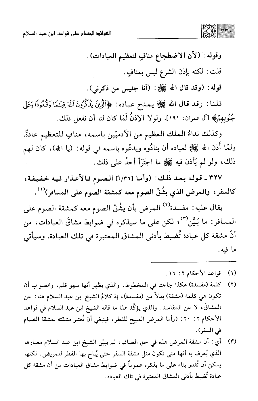 (¬3) أي: أن مشقة المرض هذه في حق الصائم، لم يبيّن الشيخ ابن عبد السلام معيارها الذي يُعرف به أنها متى تكون مثل مشقة السفر حتى يُباح بها الفطر للمريض. لكنها يمكن أن تُقدر بناء على ما يذكره عمومًا في ضوابط مشاق العبادات من أن مشقة كل عبادة تُضبط بأدنى المشاق المعتبرة في تلك العبادة.