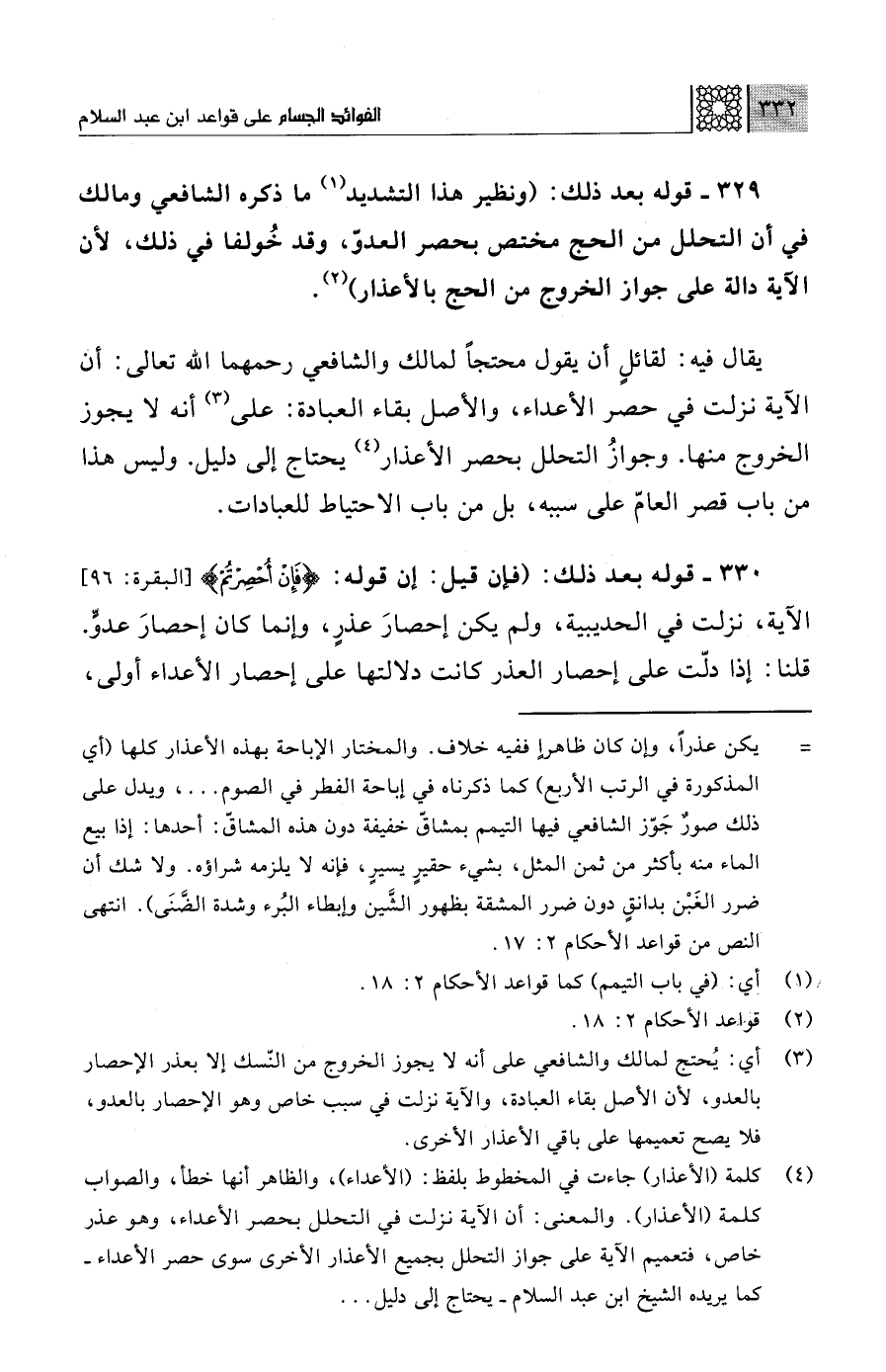 329 - قوله بعد ذلك: (ونظير هذا التشديد (¬1) ما ذكره الشافعي ومالك في أن التحلل من الحج مختص بحصر العدوّ، وقد خُولفا في ذلك، لأن الآية دالة على جواز الخروج من الحج بالأعذار) (¬2).