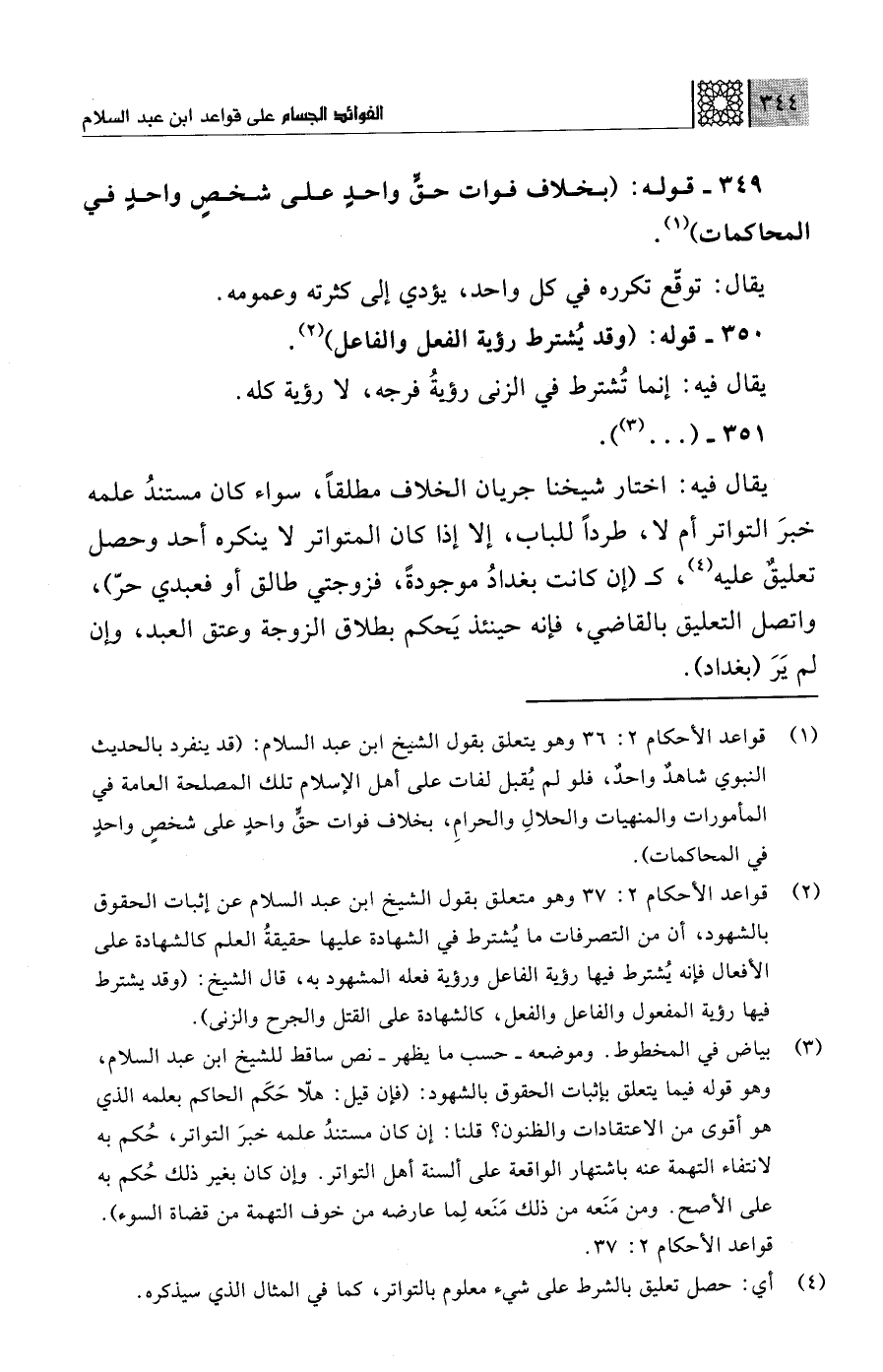 (¬2) قواعد الأحكام 2: 37 وهو متعلق بقول الشيخ ابن عبد السلام عن إثبات الحقوق بالشهود، أن من التصرفات ما يُشترط في الشهادة عليها حقيقةُ العلم كالشهادة على الأفعال فإنه يُشترط فيها رؤية الفاعل ورؤية فعله المشهود به، قال الشيح: (وقد يشترط فيها رؤية المفعول والفاعل والفعل، كالشهادة على القتل والجرح والزنى).