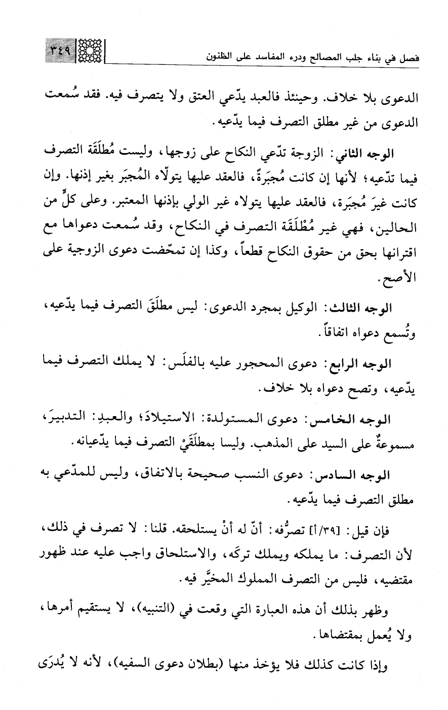 الوجه الثاني: الزوجة تدّعي النكاح على زوجها، وليست مُطلَقَة التصرف فيما تدّعيه؛ لأنها إن كانت مُجبَرةً، فالعقد عليها يتولّاه المُجبَر بغير إذنها. وإن كانت غيرَ مُجبَرة، فالعقد عليها يتولاه غير الولي بإذنها المعتبر. وعلى كلٍّ من الحالين، فهي غير مُطْلَقَة التصرف في النكاح، وقد سُمعت دعواها مع اقترانها بحق من حقوق النكاح قطعًا، وكذا إن تمحّضت دعوى الزوجية على الأصح.