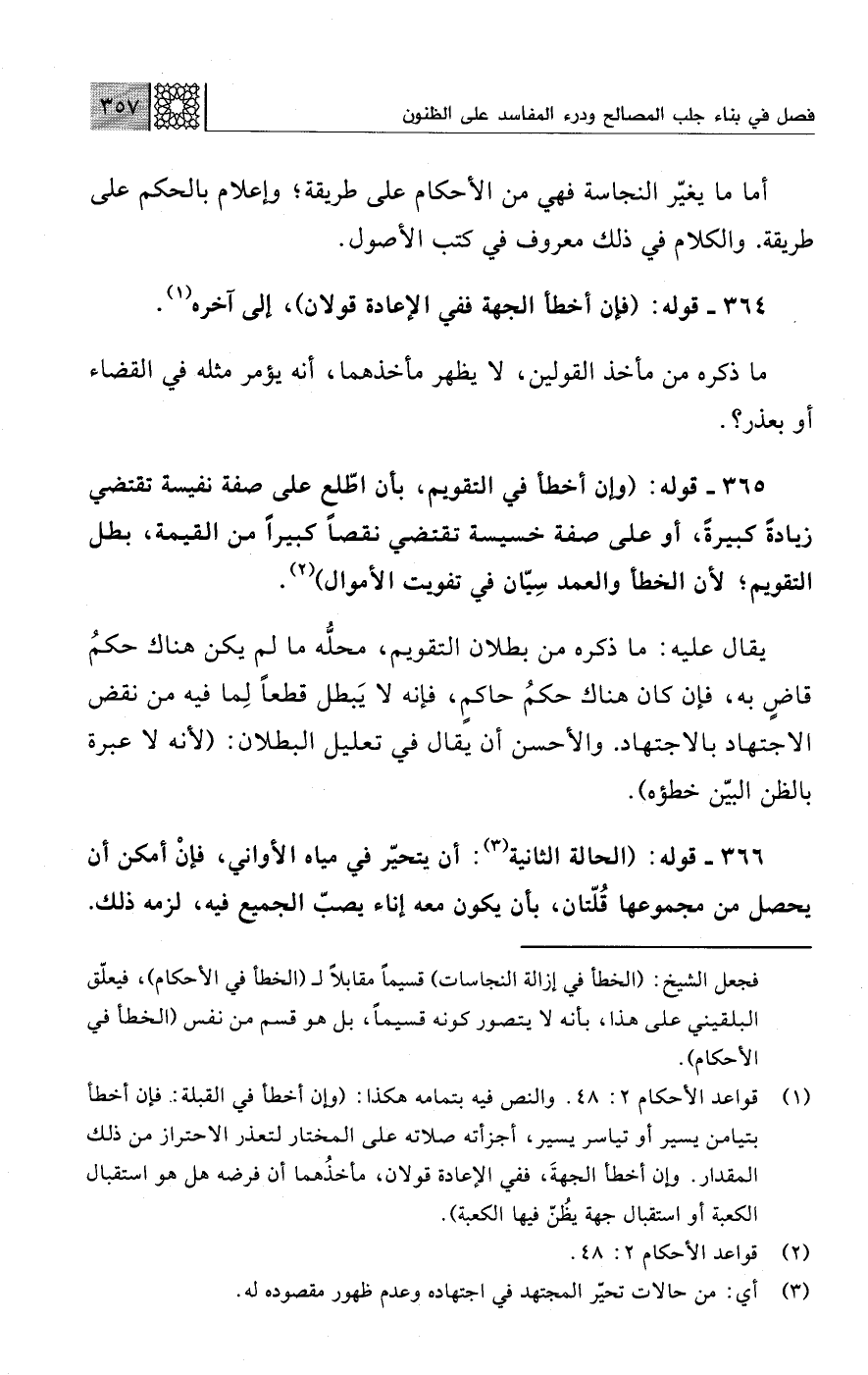 (¬1) قواعد الأحكام 2: 48. والنص فيه بتمامه هكذا: (وإن أخطأ في القبلة: فإن أخطأ بتيامن يسير أو تياسر يسير، أجزأته صلاته على المختار لتعذر الاحتراز من ذلك المقدار. وإن أخطأ الجهةَ، ففي الإعادة قولان، مأخذُهما أن فرضه هل هو استقبال الكعبة أو استقبال جهة يظُنّ فيها الكعبة).