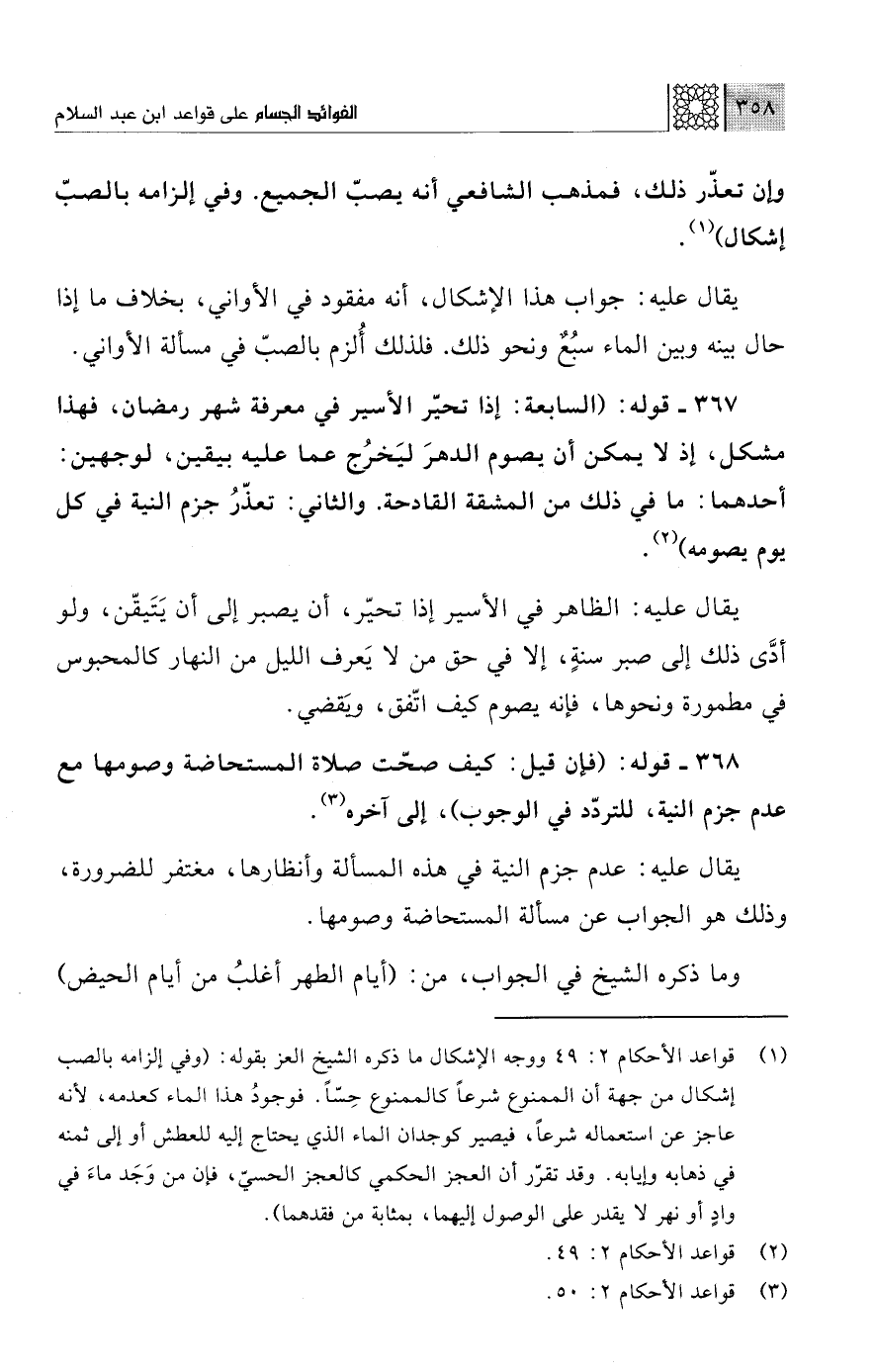 (¬1) قواعد الأحكام 2: 49 ووجه الإشكال ما ذكره الشيخ العز بقوله: (وفي إلزامه بالصب إشكال من جهة أن الممنوع شرعًا كالممنوع حِسًّا. فوجودُ هذا الماء كعدمه، لأنه عاجز عن استعماله شرعًا، فيصير كوجدان الماء الذي يحتاج إليه للعطش أو إلى ثمنه في ذهابه وإيابه. وقد تقرّر أن العجز الحكمي كالعجز الحسيّ، فإن من وَجَد ماءَ في وادٍ أو نهر لا يقدر على الوصول إليهما، بمثابة من فقدهما).