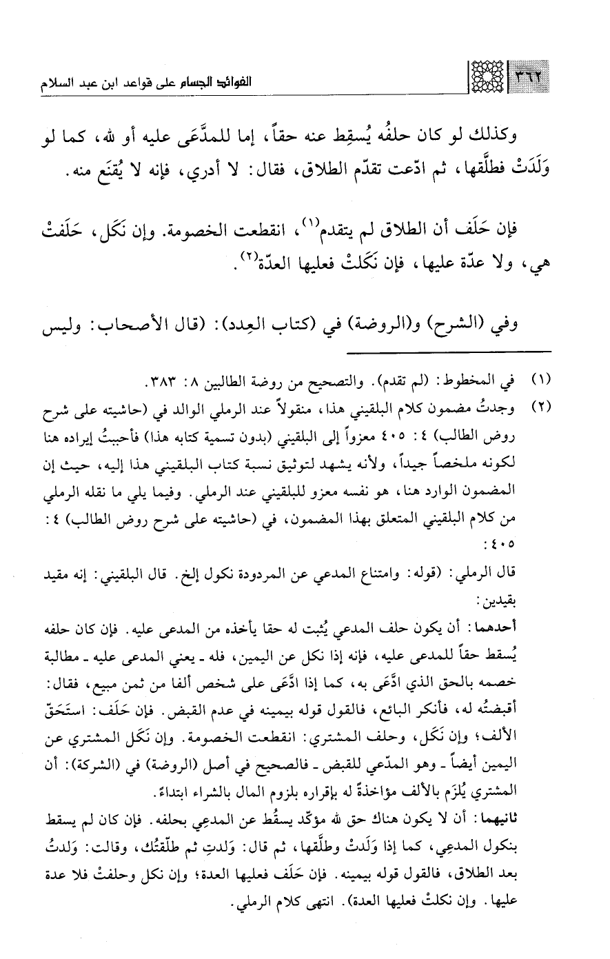 (¬2) وجدتُ مضمون كلام البلقيني هذا، منقولًا عند الرملي الوالد في (حاشيته على شرح روض الطالب) 4: 405 معزوًا إلى البلقيني (بدون تسمية كتابه هذا) فأحببتُ إيراده هنا لكونه ملخصًا جيدًا، ولأنه يشهد لتوثيق نسبة كتاب البلقيني هذا إليه، حيث إن المضمون الوارد هنا، هو نفسه معزو للبلقيني عند الرملي. وفيما يلي ما نقله الرملي من كلام البلقيني المتعلق بهذا المضمون، في (حاشيته على شرح روض الطالب) 4: 405: