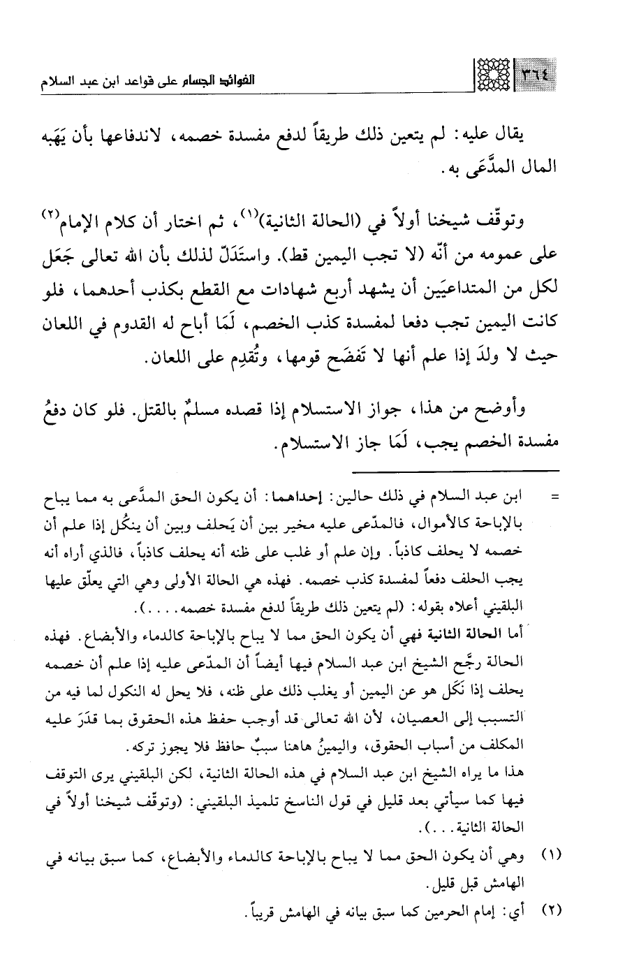 = ابن عبد السلام في ذلك حالين: إحداهما: أن يكون الحق المدَّعى به مما يباح بالإباحة كالأموال، فالمدّعى عليه مخير بين أن يَحلف وبين أن ينكُل إذا علم أن خصمه لا يحلف كاذبًا. وإن علم أو غلب على ظنه أنه يحلف كاذبًا، فالذي أراه أنه يجب الحلف دفعًا لمفسدة كذب خصمه. فهذه هي الحالة الأولى وهي التي يعلّق عليها البلقيني أعلاه بقوله: (لم يتعين ذلك طريقًا لدفع مفسدة خصمه ....).
