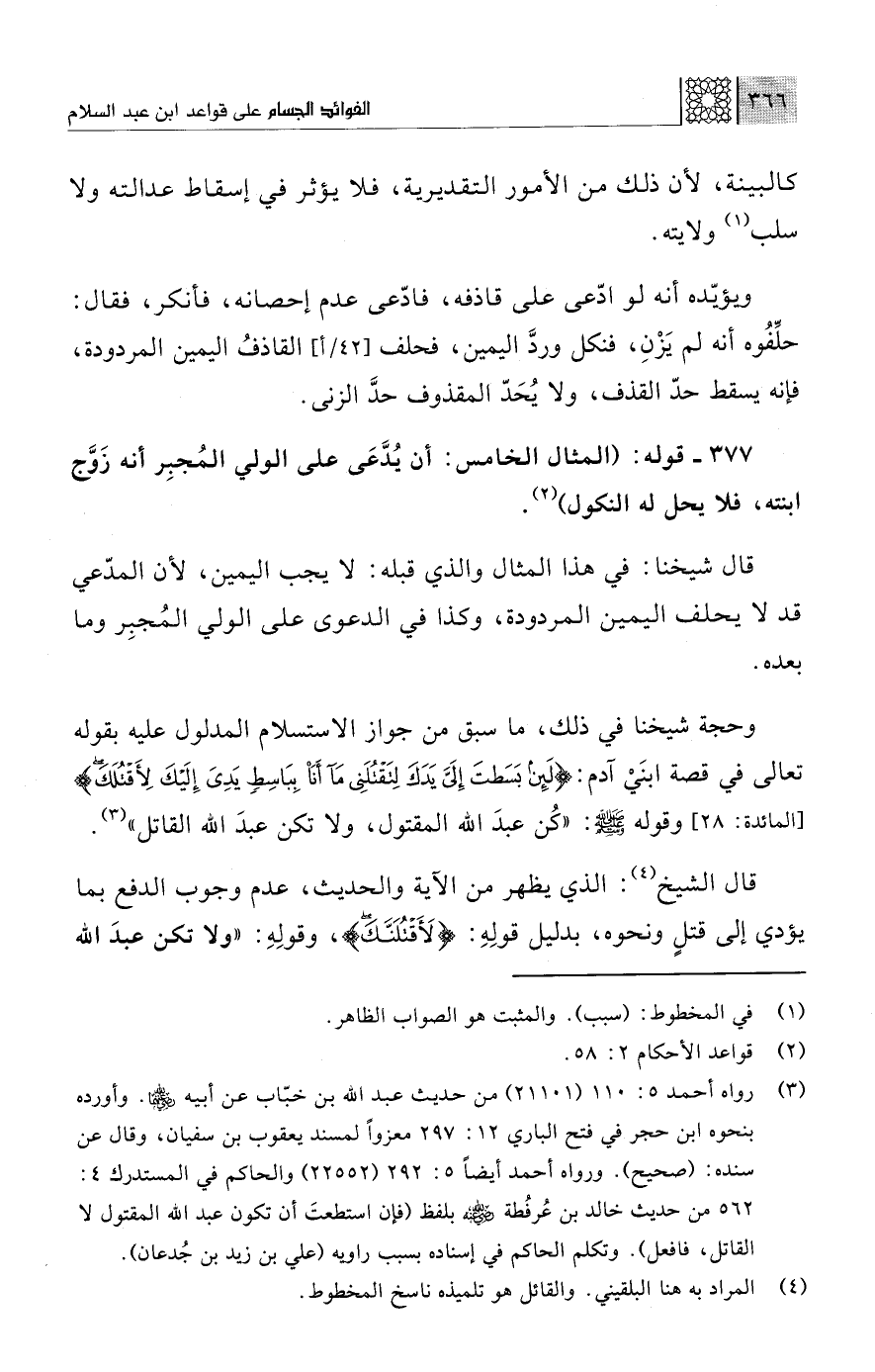 (¬3) رواه أحمد 5: 110 (21101) من حديث عبد الله بن خبّاب عن أبيه - رضي الله عنهما -. وأورده بنحوه ابن حجر في فتح الباري 12: 297 معزوًا لمسند يعقوب بن سفيان، وقال عن سنده: (صحيح). ورواه أحمد أيضًا 5: 292 (22552) والحاكم في المستدرك 4: 562 من حديث خالد بن عُرفُطة - رضي الله عنه - بلفظ (فإن استطعتَ أن تكون عبد الله المقتول لا القاتل، فافعل). وتكلم الحاكم في إسناده بسبب راويه (علي بن زيد بن جُدعان).