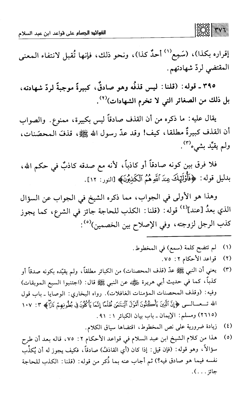 (¬5) هذا من كلام الشيخ ابن عبد السلام في قواعد الأحكام 2: 75، قاله بعد أن طرح سؤالًا، وهو قوله: (فإن قيل: إذا كان (أي القاذفُ) صادقًا، فكيف يجوز له أن يُكذِّب نفسه فيما هو صادق فيه؟) ثم أجاب عنه بما ذُكر من قوله: (قلنا: الكذب للحاجة جائز ...).