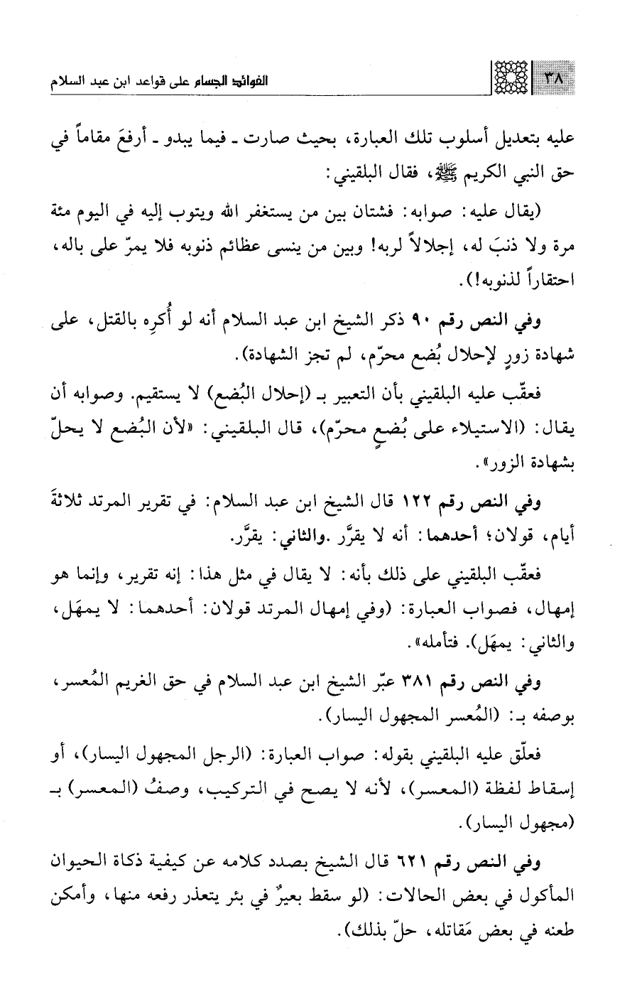 وفي النص رقم 122 قال الشيخ ابن عبد السلام: في تقرير المرتد ثلاثةَ أيام، قولان؛ أحدهما: أنه لا يقرَّر. والثاني: يقرَّر.