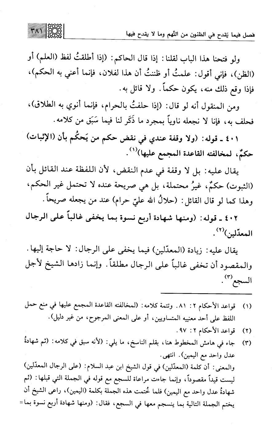 401 - قوله: (ولا وقفة عندي في نقض حكم من يَحكُم بأن (الأثبات) حكمٌ، لمخالفته القاعدة المجمع عليها) (¬1).