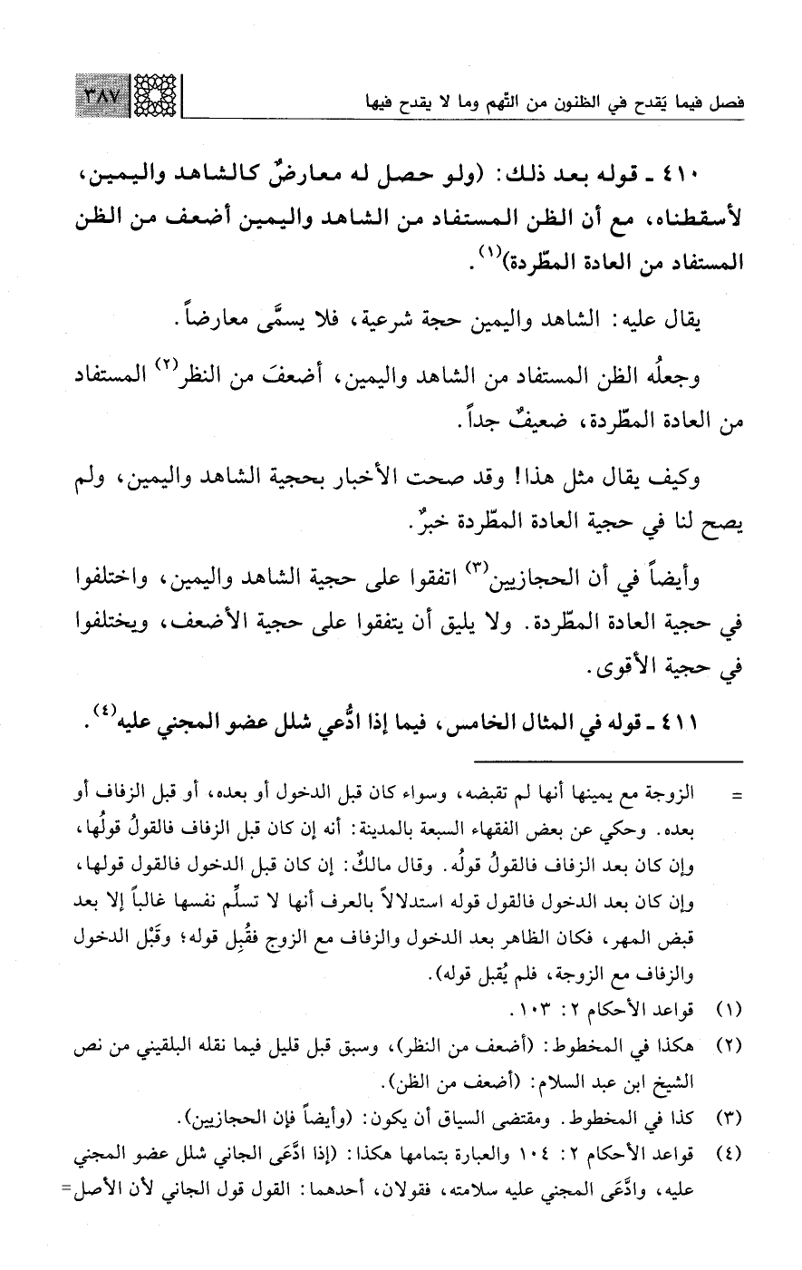 410 - قوله بعد ذلك: (ولو حصل له معارضٌ كالشاهد واليمين، لأسقطناه، مع أن الظن المستفاد من الشاهد واليمين أضعف من الظن المستفاد من العادة المطّردة) (¬1).