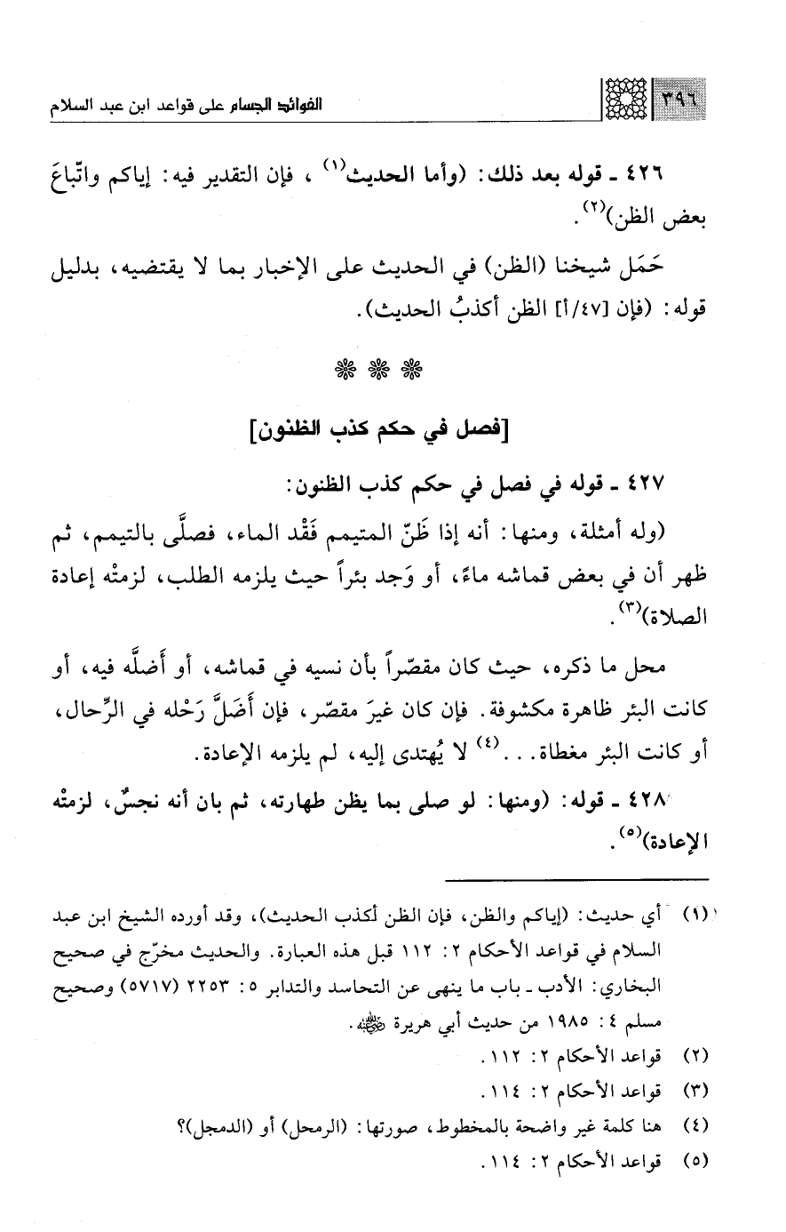 (¬1) أي حديث: (إياكم والظن، فإن الظن أكذب الحديث)، وقد أورده الشيخ ابن عبد السلام في قواعد الأحكام 2: 112 قبل هذه العبارة. والحديث مخرّج في صحيح البخاري: الأدب -باب ما ينهى عن التحاسد والتدابر 5: 2253 (5717) وصحيح مسلم 4: 1985 من حديث أبي هريرة - رضي الله عنه -.