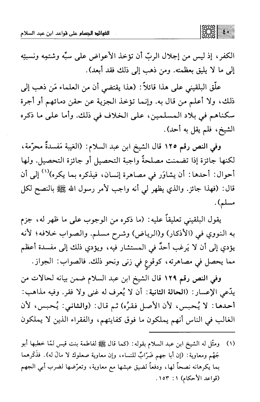 وفي النص رقم 129 قال الشيخ ابن عبد السلام ضمن بيانه لحالات من يدّعي الإعسار: (الحالة الثانية: أن لا يُعرف له غنى ولا فقر. وفيه مذاهب: أحدها: لا يُحبس، لأن الأصل فقرُه) ثم قال: (والثاني: يُحبس، لأن الغالب في الناس أنهم يملكون ما فوق كفايتهم، والفقراء الذين لا يملكون