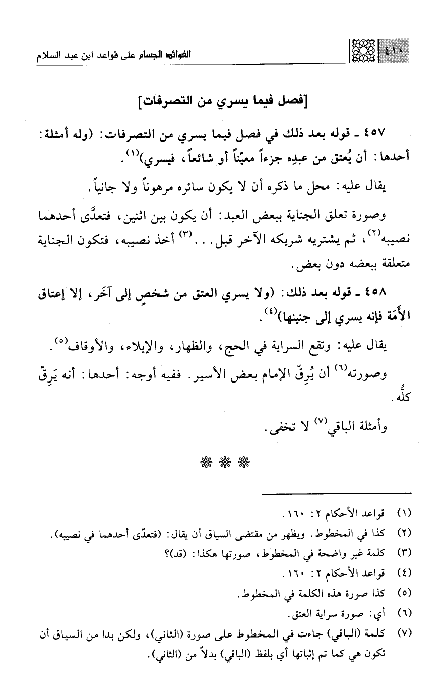 457 - قوله بعد ذلك في فصل فيما يسري من التصرفات: (وله أمثلة: أحدها: أن يُعتق من عبدِه جزءًا معيّنًا أو شائعًا، فيسري) (¬1).