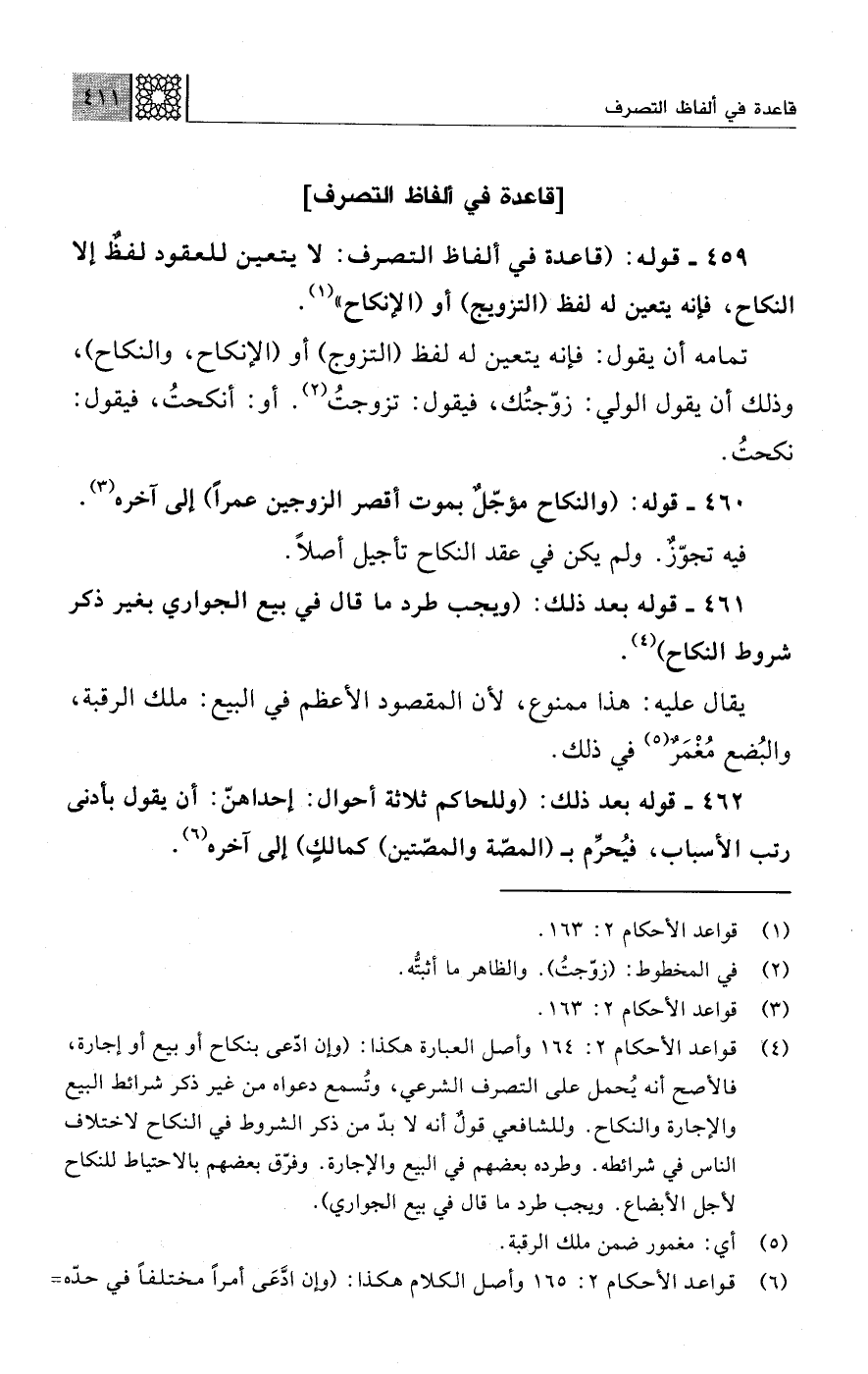 (¬4) قواعد الأحكام 2: 164 وأصل العبارة هكذا: (وإن ادّعى بنكاح أو بيع أو إجارة، فالأصح أنه يُحمل على التصرف الشرعي، وتُسمع دعواه من غير ذكر شرائط البيع والإجارة والنكاح. وللشافعي قولٌ أنه لا بدّ من ذكر الشروط في النكاح لاختلاف الناس في شرائطه. وطرده بعضهم في البيع والإجارة. وفرّق بعضهم بالاحتياط للنكاح لأجل الأبضاع. ويجب طرد ما قال في بيع الجواري).
