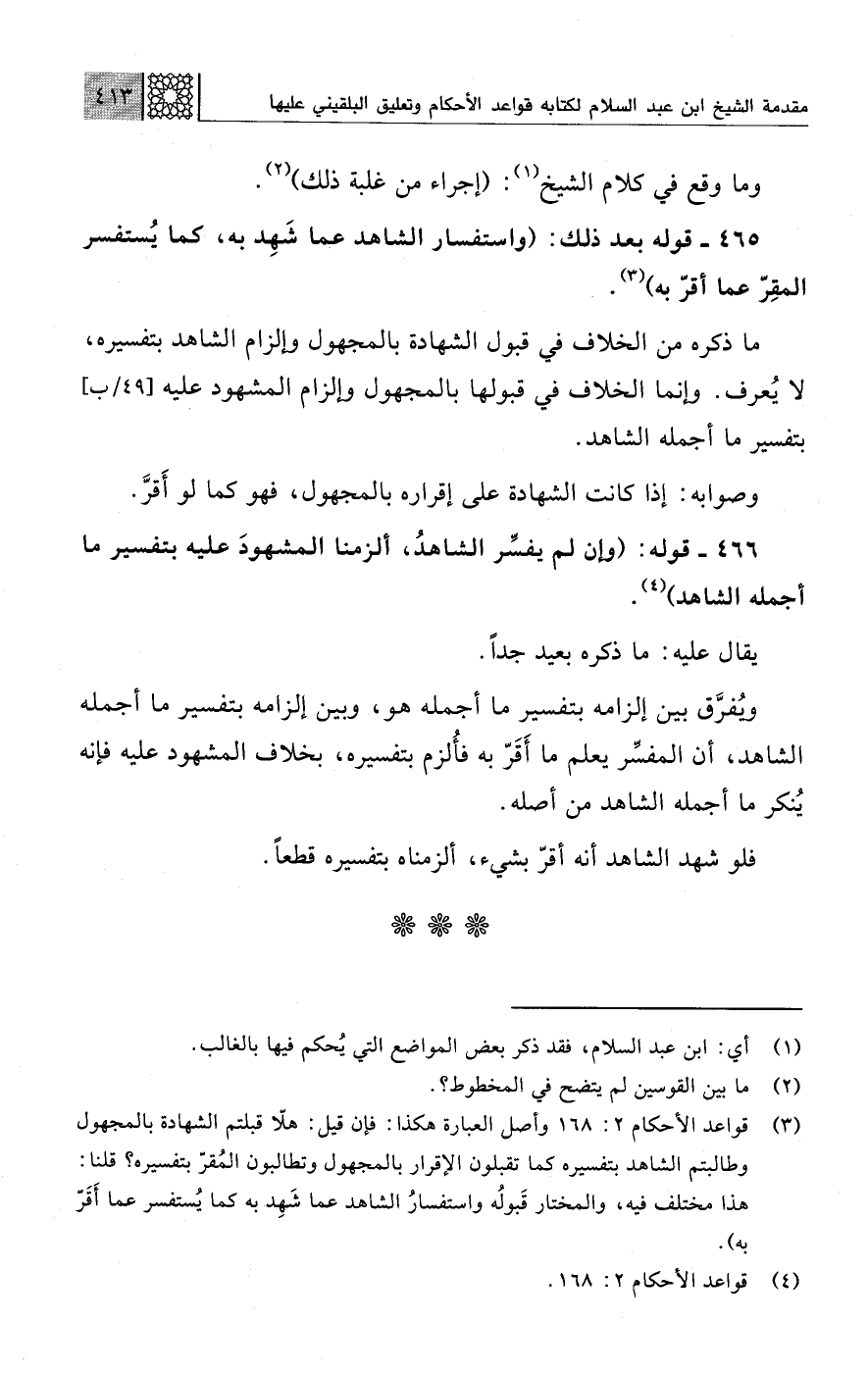 (¬3) قواعد الأحكام 2: 168 وأصل العبارة هكذا: فإن قيل: هلّا قبلتم الشهادة بالمجهول وطالبتم الشاهد بتفسيره كما تقبلون الإقرار بالمجهول وتطالبون المُقرّ بتفسيره؟ قلنا: هذا مختلف فيه، والمختار قَبولُه واستفسارُ الشاهد عما شَهِد به كما يُستفسر عما أَقَرّ به).