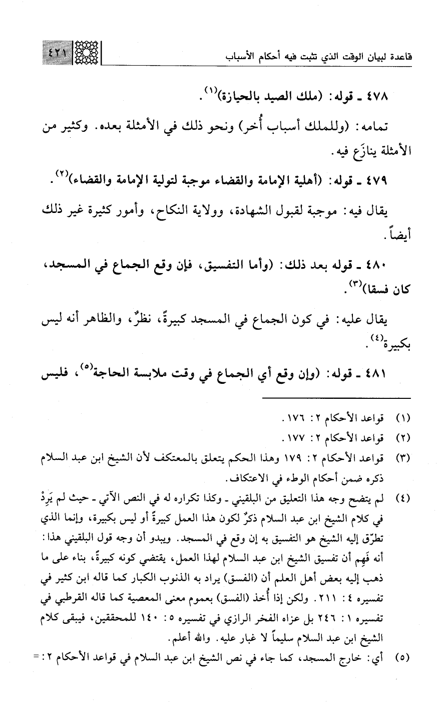 (¬3) قواعد الأحكام 2: 179 وهذا الحكم يتعلق بالمعتكف لأن الشيخ ابن عبد السلام ذكره ضمن أحكام الوطء في الاعتكاف.