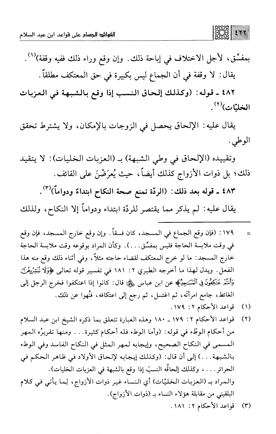 (¬2) قواعد الأحكام 2: 179 - 180 وهذه العبارة تتعلق بما ذكره الشيخ ابن عبد السلام من أحكام الوطْء في قوله: (وأما الوطء فله أحكام كثيرة ... ومنها تقريرُه المهر المسمى في النكاح الصحيح، وإيجابه لمهر المثل في النكاح الفاسد وفي الوطء بالشبهة ...) إلى أن قال: (وكذلك إيجابه لإلحاق الأولاد في ظاهر الحكم في الحرائر ... ، وكذلك إلحاقُه النسبَ إذا وقع بالشبهة في العزبات الخليات).