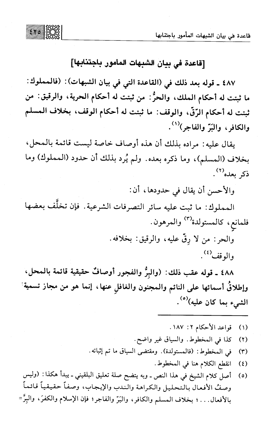 487 - قوله بعد ذلك في (القاعدة التي في بيان الشبهات): (فالمملوك: ما ثبتت له أحكام الملك، والحرُّ: من ثبتت له أحكام الحرية، والرقيق: من ثبتت له أحكام الرّقّ، والوقف: ما ثبتت له أحكام الوقف، بخلاف المسلم والكافر، والبَرّ والفاجر) (¬1).