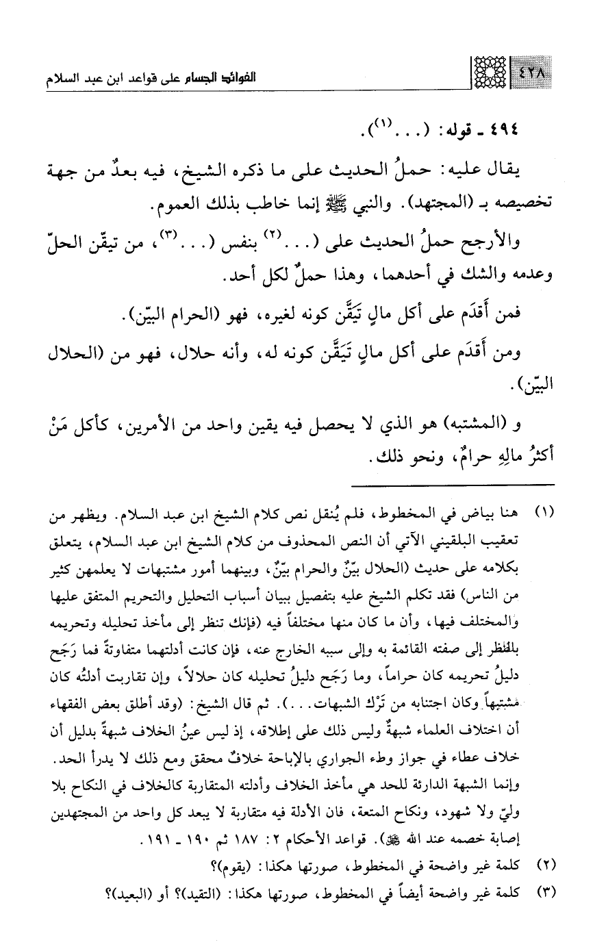 (¬1) هنا بياض في المخطوط، فلم يُنقل نص كلام الشيخ ابن عبد السلام. ويظهر من تعقيب البلقيني الآتي أن النص المحذوف من كلام الشيخ ابن عبد السلام، يتعلق بكلامه على حديث (الحلال بيّنٌ والحرام بيّنٌ، وبينهما أمور مشتبهات لا يعلمهن كثير من الناس) فقد تكلم الشيخ عليه بتفصيل ببيان أسباب التحليل والتحريم المتفق عليها والمختلف فيها، وأن ما كان منها مختلفًا فيه (فإنك تنظر إلى مأخذ تحليله وتحريمه بالنظر إلى صفته القائمة به وإلى سببه الخارج عنه، فإن كانت أدلتهما متفاوتةً فما رَجَح دليلُ تحريمه كان حرامًا، وما رَجَح دليلُ تحليله كان حلالًا، وإن تقاربت أدلتُه كان مشتبهًا وكان اجتنابه من تَرْك الشبهات ...). ثم قال الشيخ: (وقد أطلق بعض الفقهاء أن اختلاف العلماء شبهةٌ وليس ذلك على إطلاقه، إذ ليس عنُ الخلاف شبهةً بدليل أن خلاف عطاء في جواز وطء الجواري بالإباحة خلافٌ محقق ومع ذلك لا يدرأ الحد. وإنما الشبهة الدارئة للحد هي مأخذ الخلاف وأدلته المتقاربة كالخلاف في النكاح بلا وليّ ولا شهود، ونكاح المتعة، فإن الأدلة فيه متقاربة لا يبعد كل واحد من المجتهدين إصابة خصمه عند الله - عزَّ وجلَّ -). قواعد الأحكام 2: 187 ثم 190 - 191.