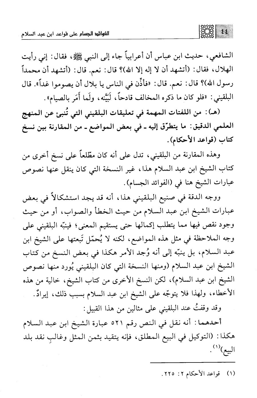 وهذه المقارنة من البلقيني، تدل على أنه كان مطّلعًا على نسخ أخرى من كتاب الشيخ ابن عبد السلام هذا، غير النسخة التي كان ينقل عنها نصوص عبارا ت الشيخ هنا في (الفوائد الجسام).