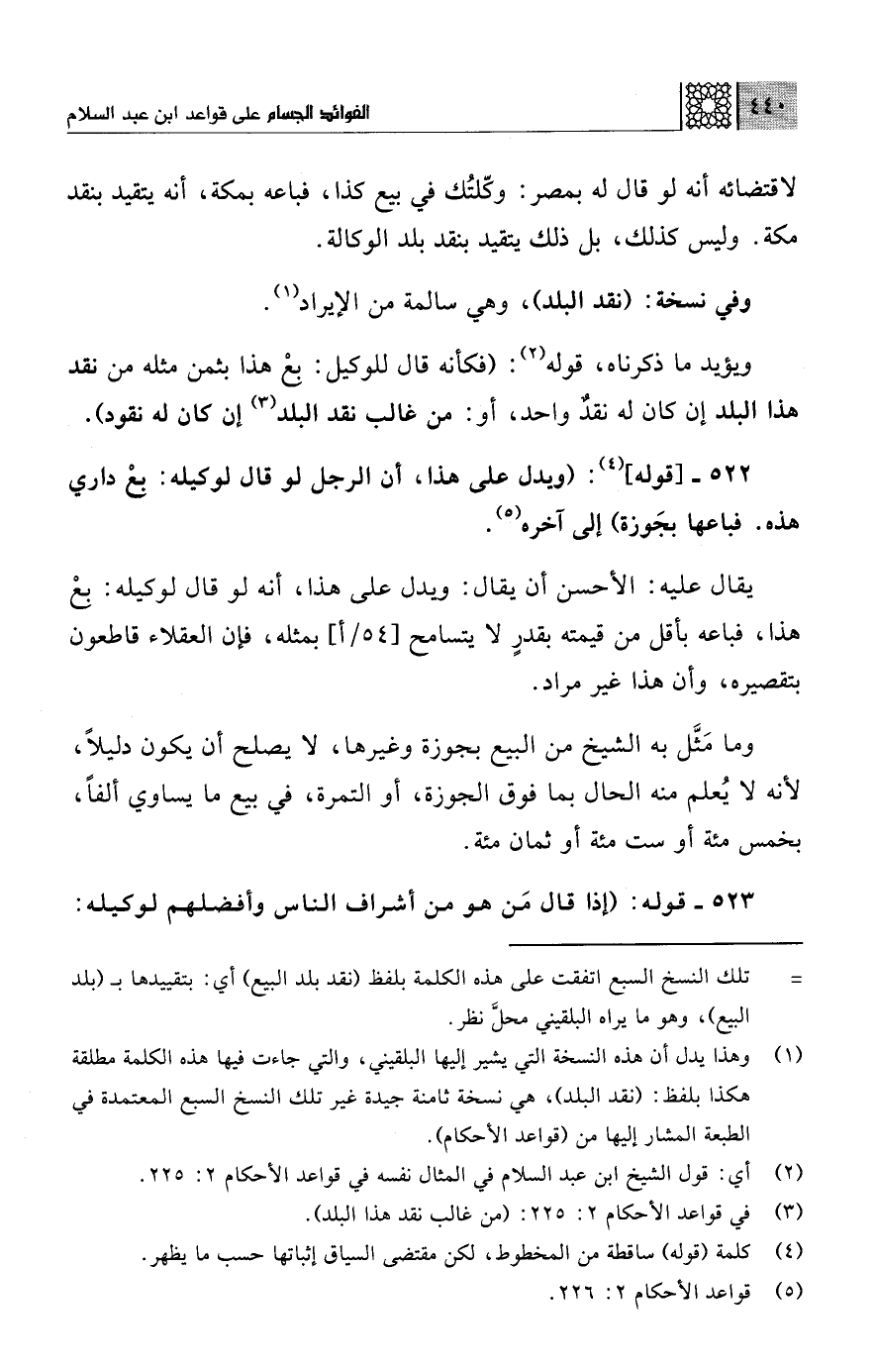 (¬1) وهذا يدل أن هذه النسخة التي يشير إليها البلقيني، والتي جاءت فيها هذه الكلمة مطلقة هكذا بلفظ: (نقد البلد)، هي نسخة ثامنة جيدة غير تلك النسخ السبع المعتمدة في الطبعة المشار إليها من (قواعد الأحكام).
