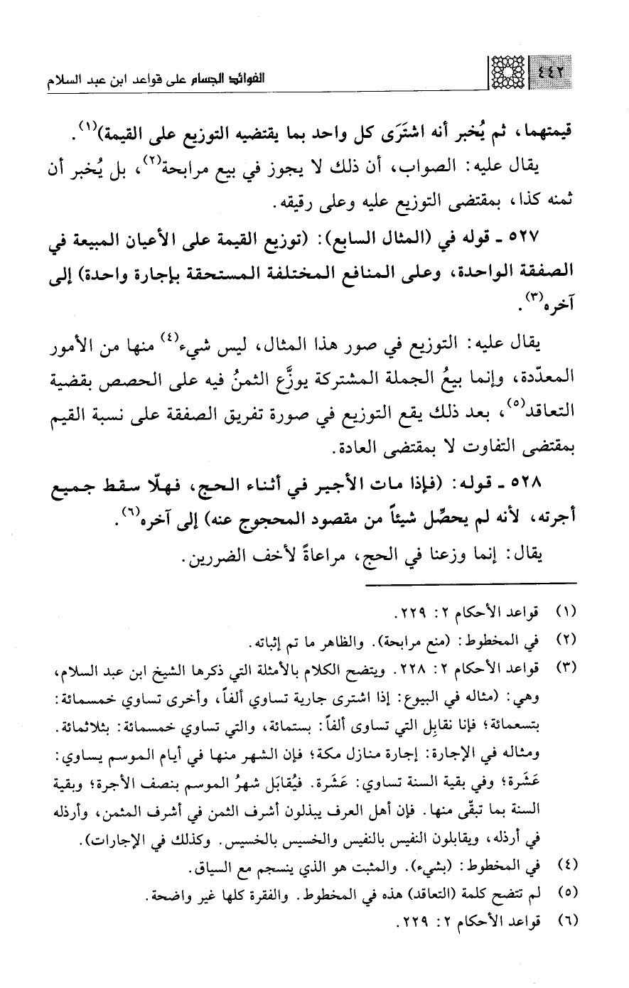 (¬3) قواعد الأحكام 2: 228. ويتضح الكلام بالأمثلة التي ذكرها الشيخ ابن عبد السلام، وهي: (مثاله في البيوع: إذا اشترى جارية تساوي ألفًا، وأخرى تساوي خمسمائة: بتسعمائة؛ فإنا نقابِل التي تساوى ألفًا: بستمائة، والتي تساوي خمسمائة: بثلاثمائة. ومثاله في الإجارة: إجارة منازل مكة؛ فإن الشهر منها في أيام الموسم يساوي: عَشَرة؛ وفي بقية السنة تساوي: عَشَرة. فيُقابَل شهرُ الموسم بنصف الأجرة؛ وبقية السنة بما تبقّى منها. فإن أهل العرف يبذلون أشرف الثمن في أشرف المثمن، وأرذله في أرذله، ويقابلون النفيس بالنفيس والخسيس بالخسيس. وكذلك في الإجارات).